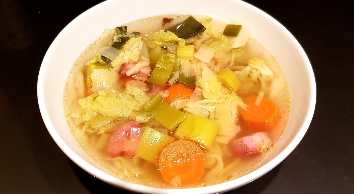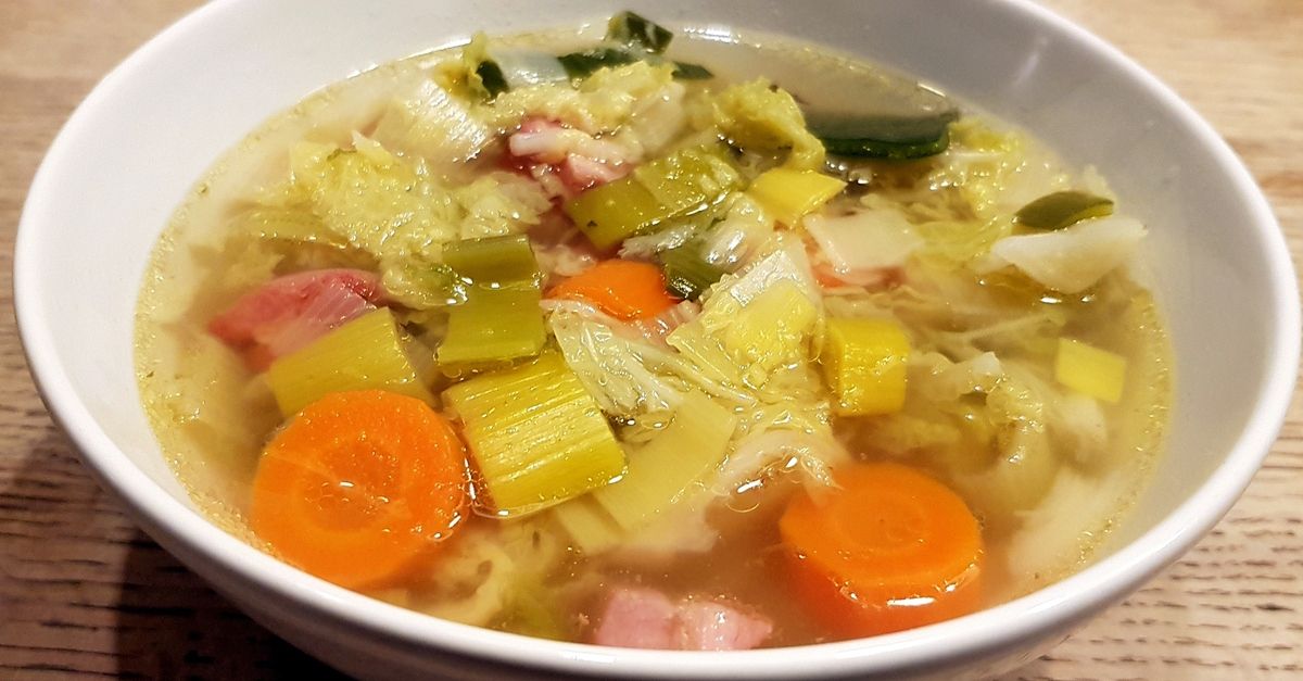 Donc, je dis: "Vive les choux! Et vive cette délicieuse et simple recette de soupe aux choux!" Parce qu'elle est BONNE. Et parce qu'elle a un bon petit goût légèrement fumé grâce au lard coupé en morceaux. Et surtout, un vrai goût de légumes. Comme à l'époque, vous savez quand nos aïeux n'avaient pas encore la CHANCE d'avoir des sachets de soupes déshydratées à dispo, pleins de conservateurs et d'exhausteurs de goûts très étranges. A l'époque, pour réaliser une soupe, ils n'avaient pas besoin de fouet pour délayer une poudre. Juste un couteau, une spatule, de bonnes odeurs, un peu de temps...