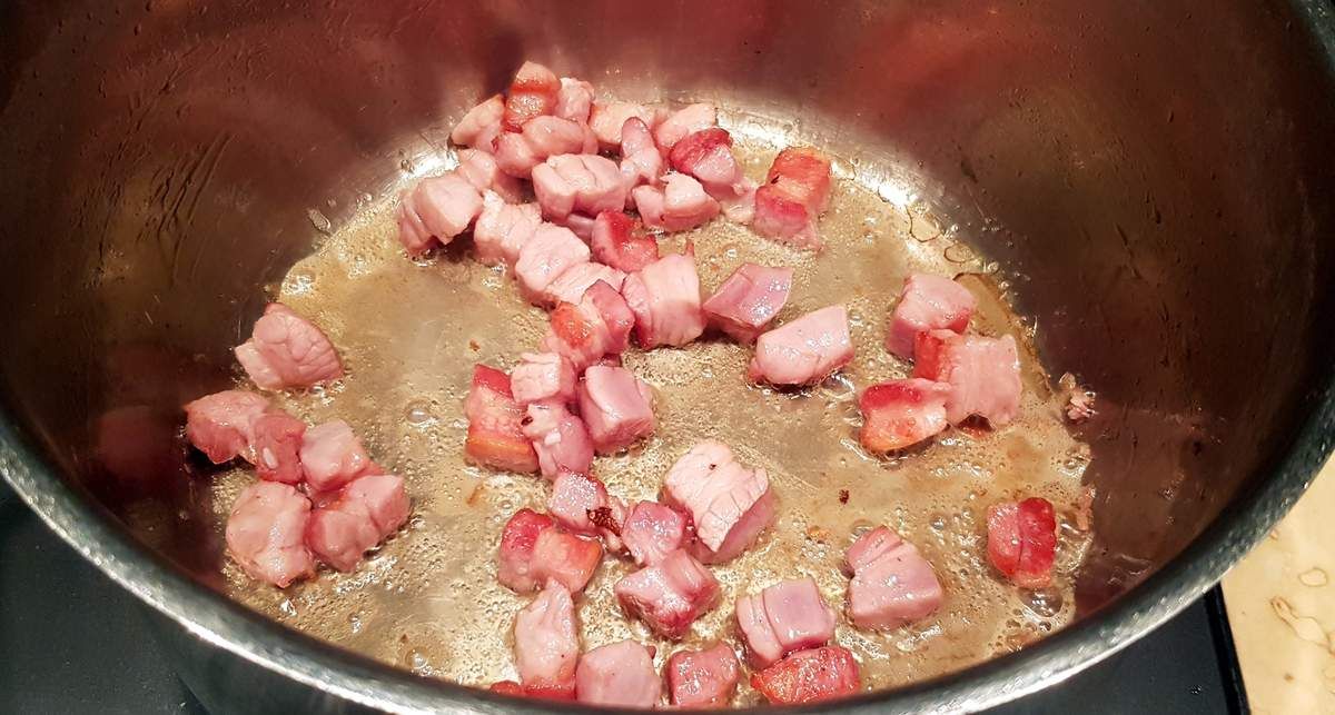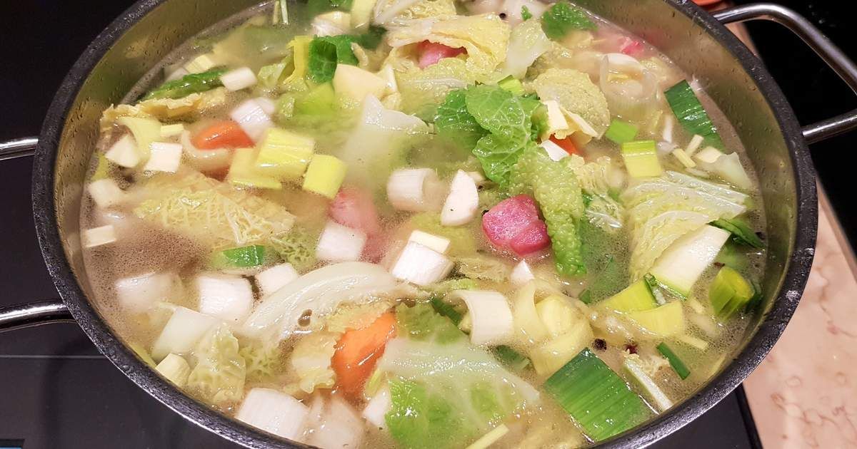 3) Dans une grande casserole, mettre un filet d'huile d'olive à chauffer et faire revenir les morceaux de lard en mélangeant quelques minutes. Ajouter ensuite tous les légumes, 3,5 litres d'eau environ (pour qu'ils soient tous bien couverts), les grains de poivre et 3 belles càc de sel. Porter à ébullition puis baisser à frémissements. Couper les feuilles de chou grossièrement et ajouter dans la casserole.