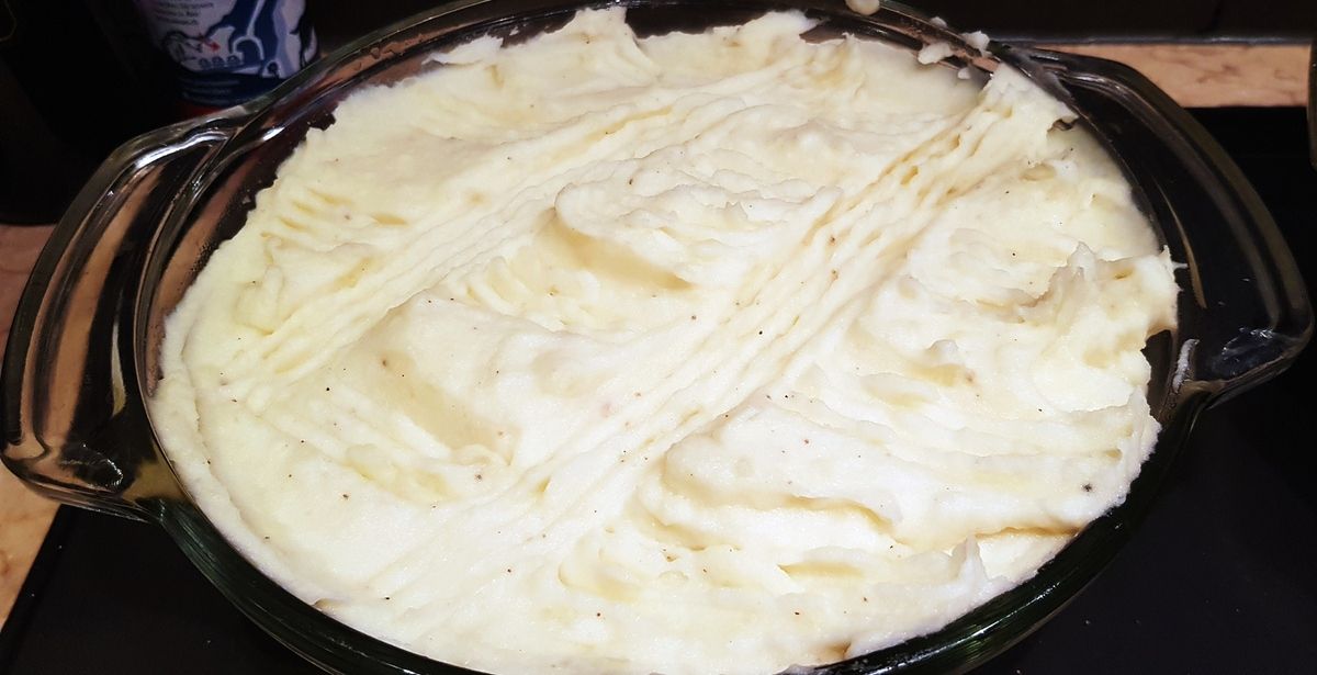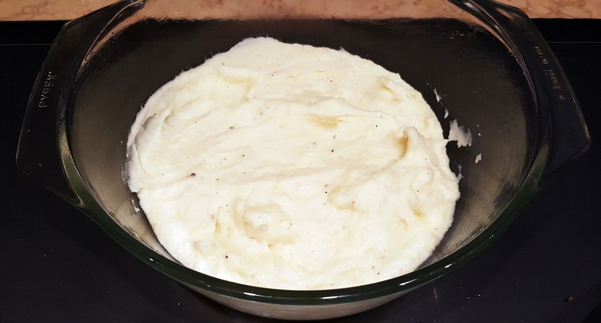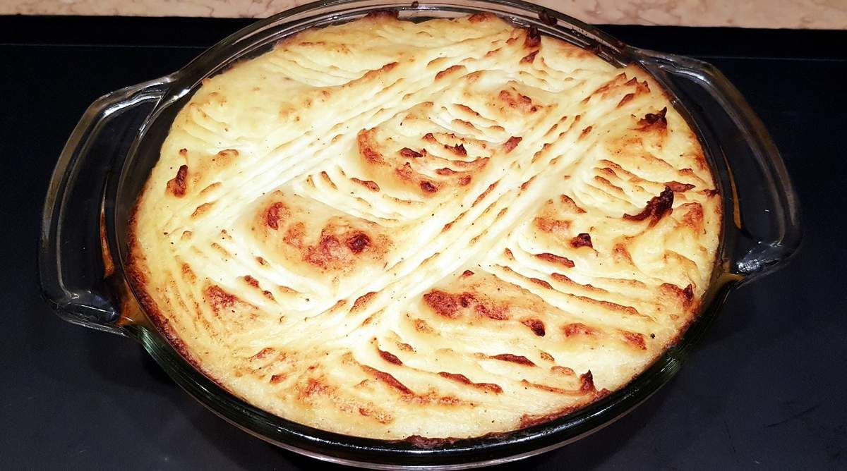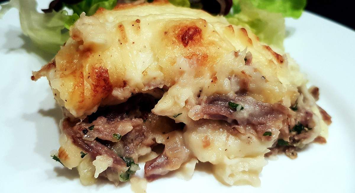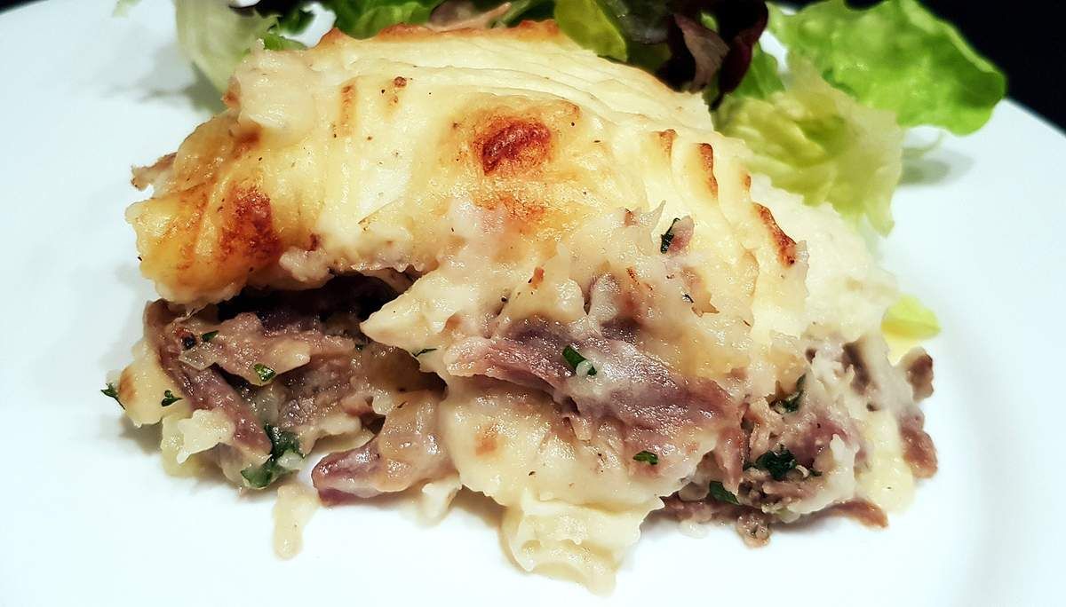 4) Le montage: préchauffer le four à 200°c. Graisser un plat à gratin avec de la graisse de canard réservée. Dans le plat, déposer une petite couche de purée (le tiers environ), puis le hachis. Recouvrir avec le reste de la purée. Lisser le dessus avec une fourchette en créant des lignes perpendiculaires.