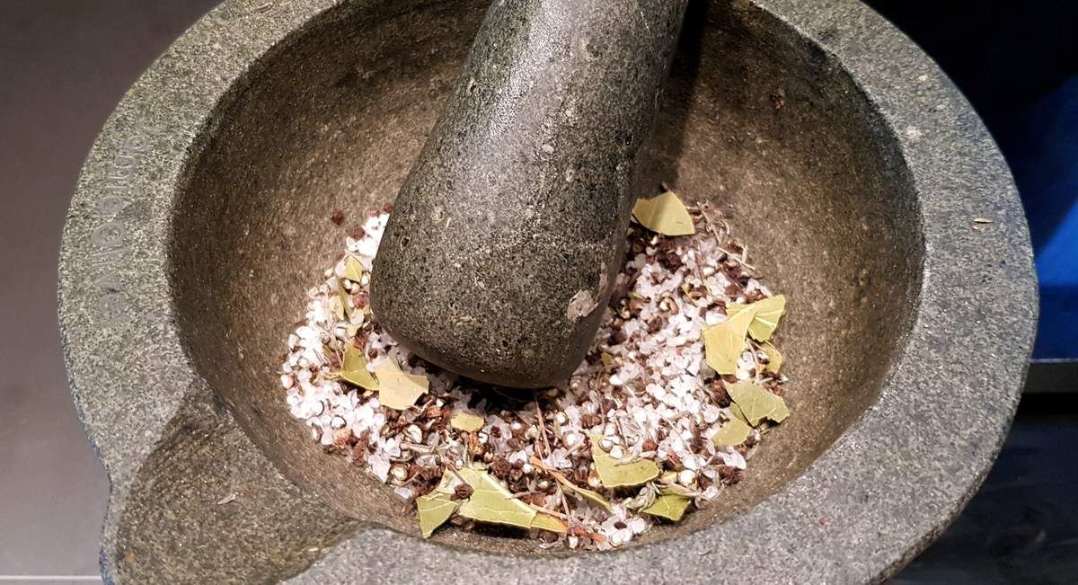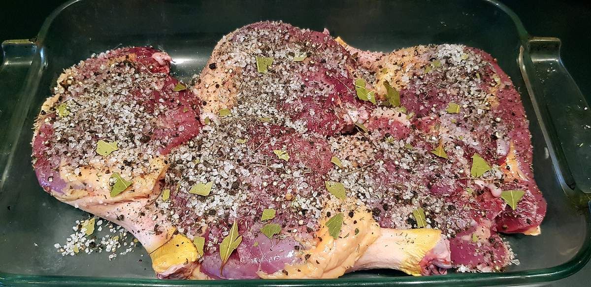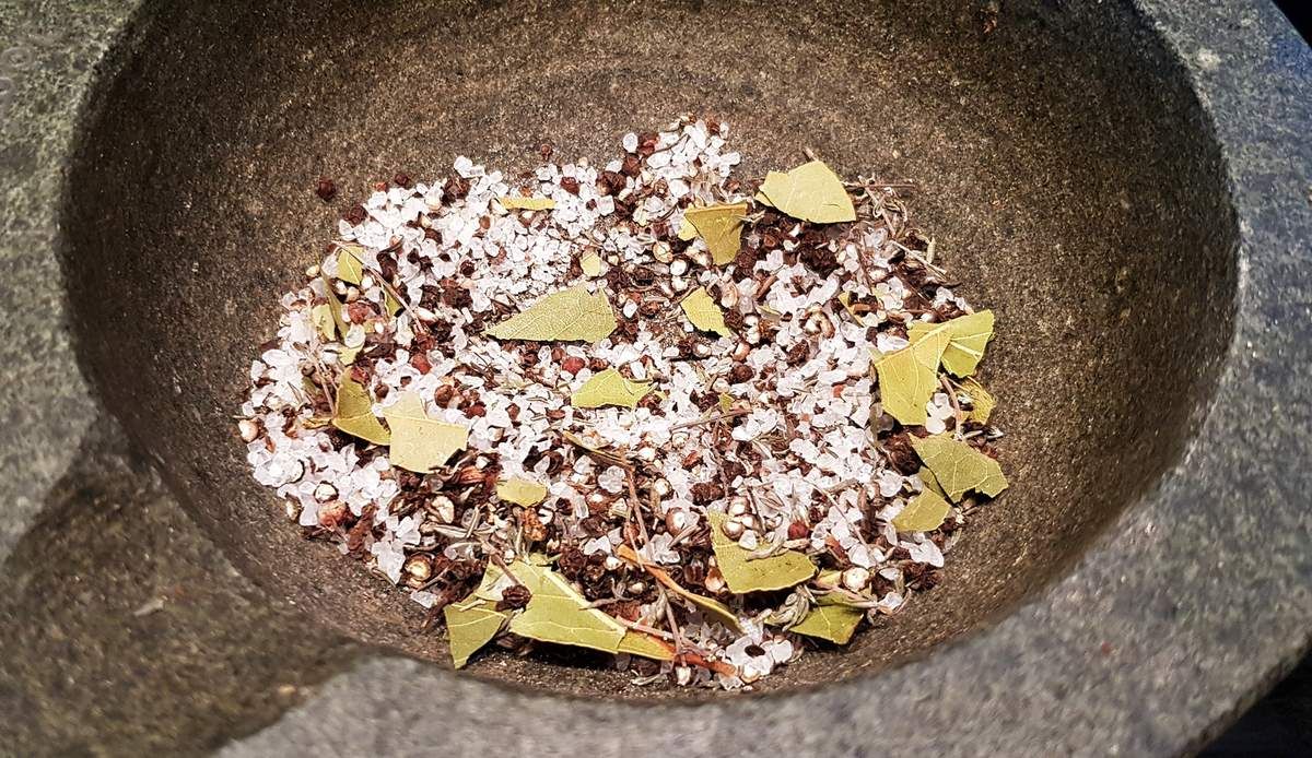Mélange d'épices: 1 grosse càs de poivre noir concassé, 40g de gros sel, 3 feuilles de laurier émiettées, 1 branche de thym séché grossièrement hachée)