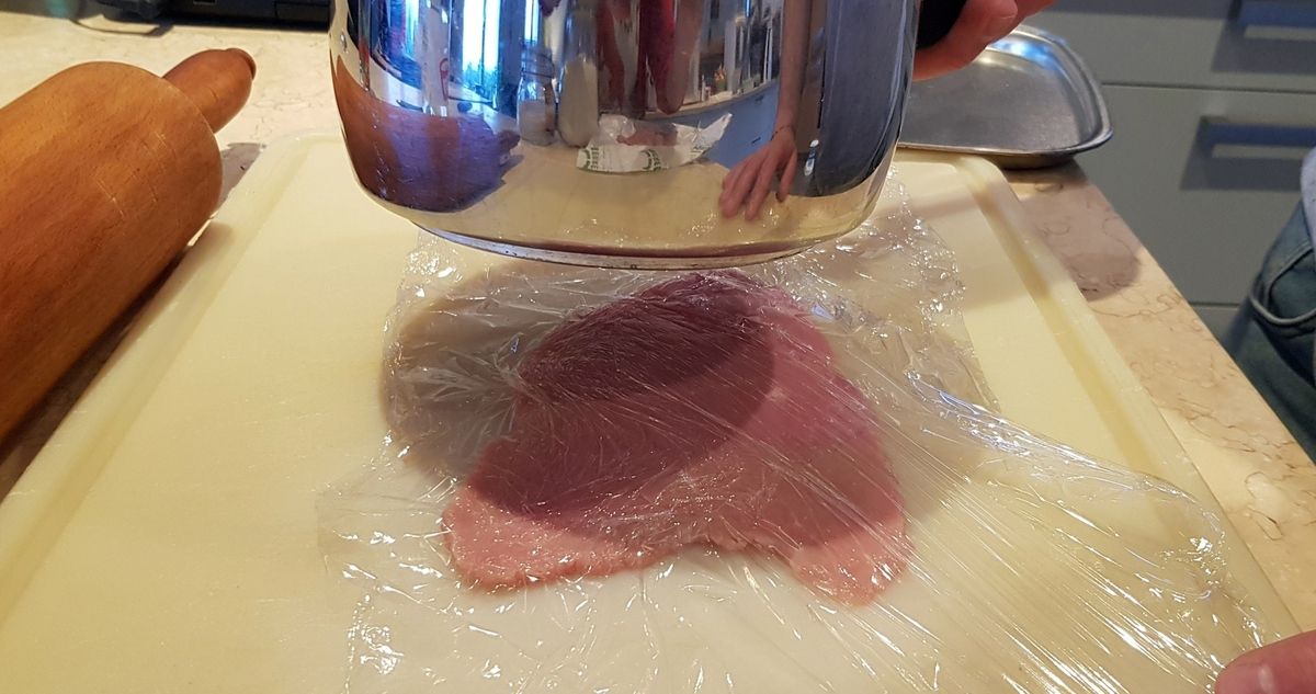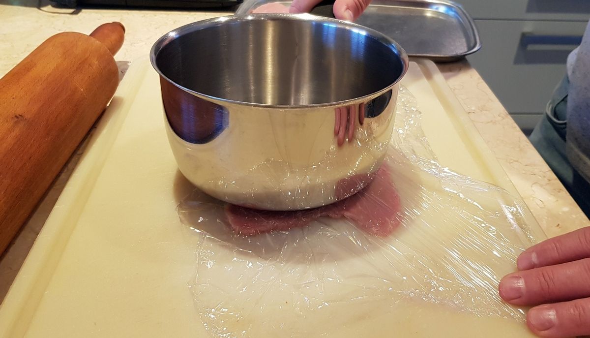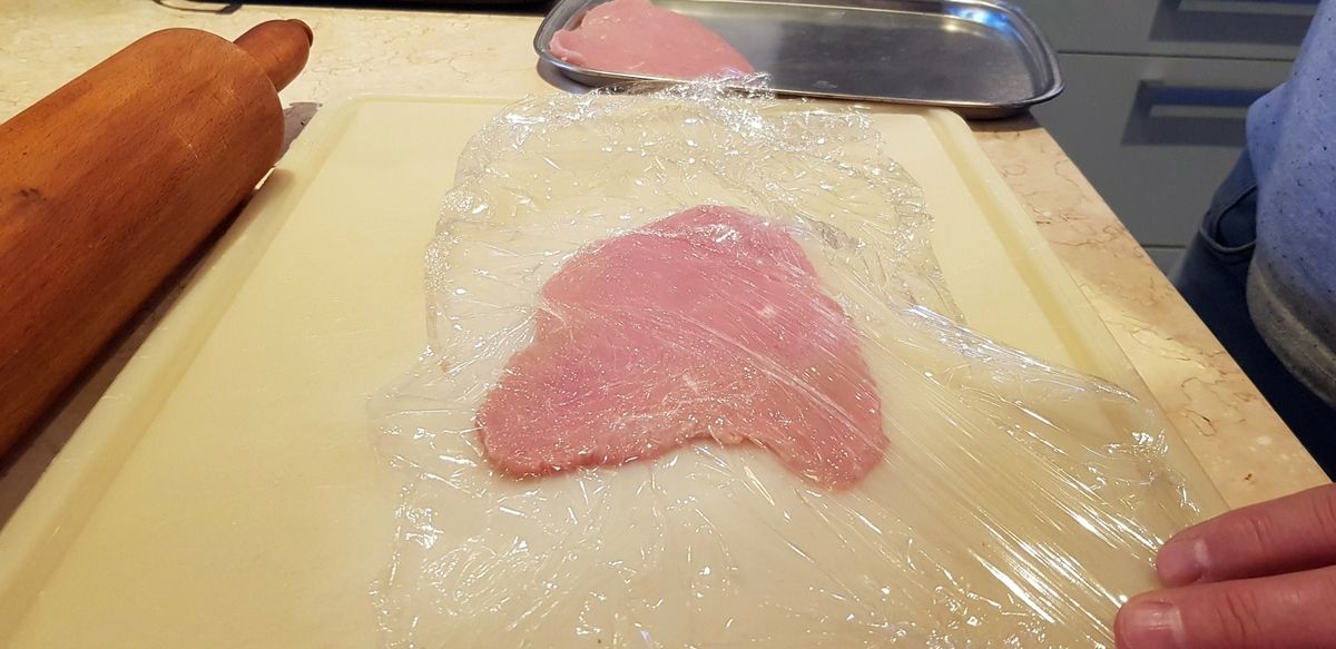 1) Poser une tranche de viande sur une planche et la recouvrir avec un papier film. A l'aide d'une casserole par exemple, taper la tranche de toutes parts pour détendre la viande et l'aplatir afin de former une belle tranche fine. Répéter l'opération pour chaque tranche.