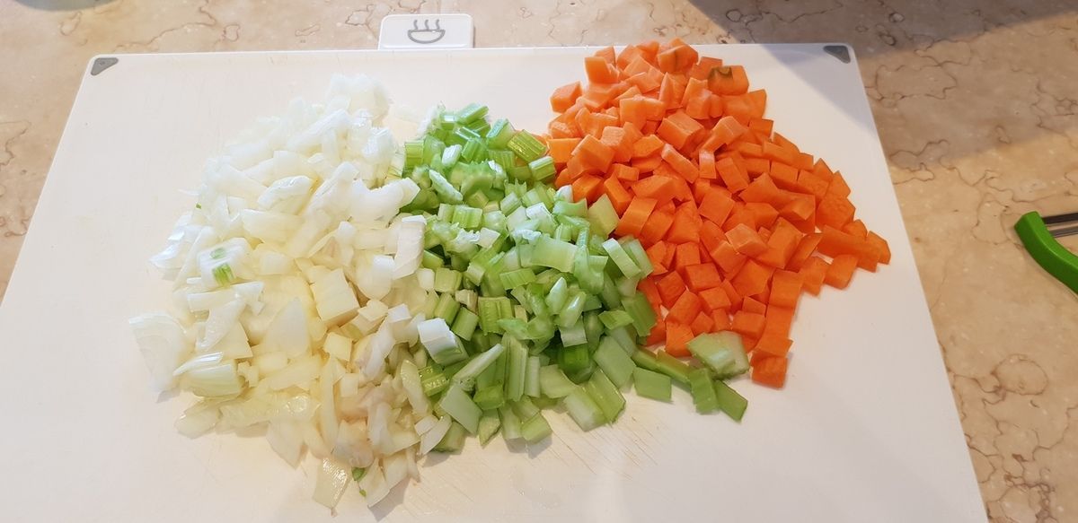 4) Préparer parallèlement le jus d'agneau: couper en petits dés les carottes, le céleri branche et l'oignon. Couper la tomate en morceaux. Couper la tête d'ail en deux à l'horizontale. Hacher grossièrement le persil.