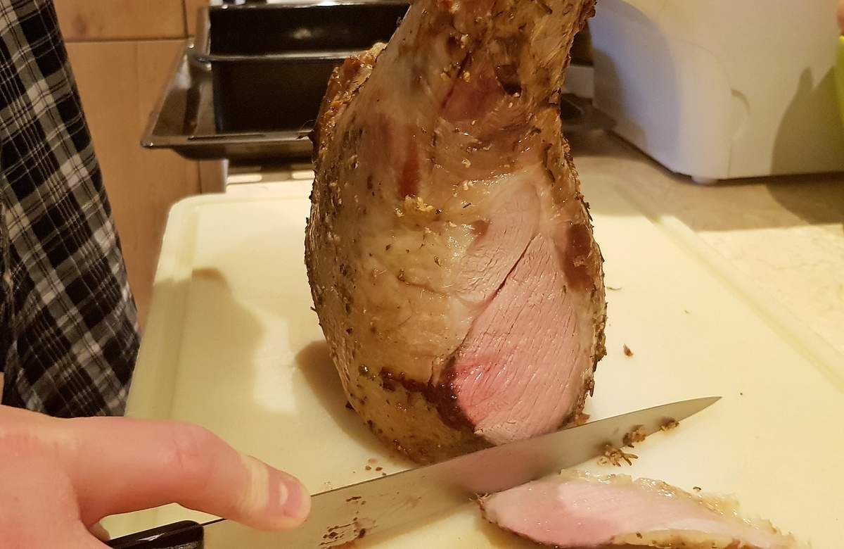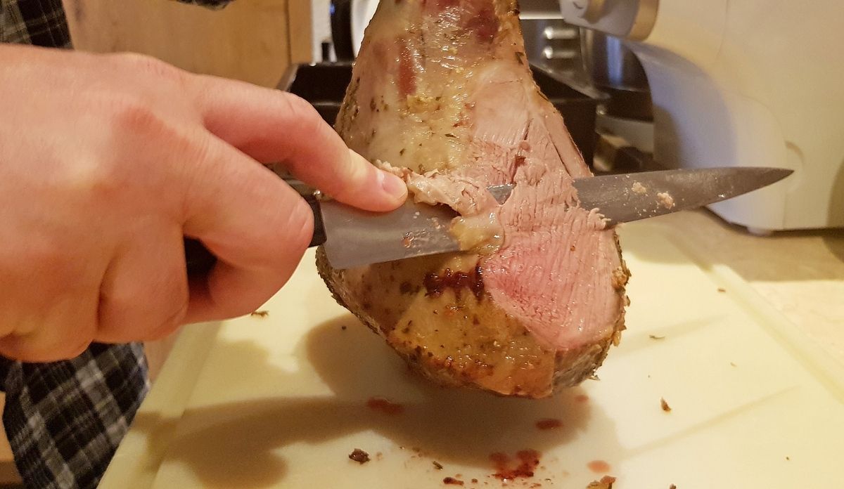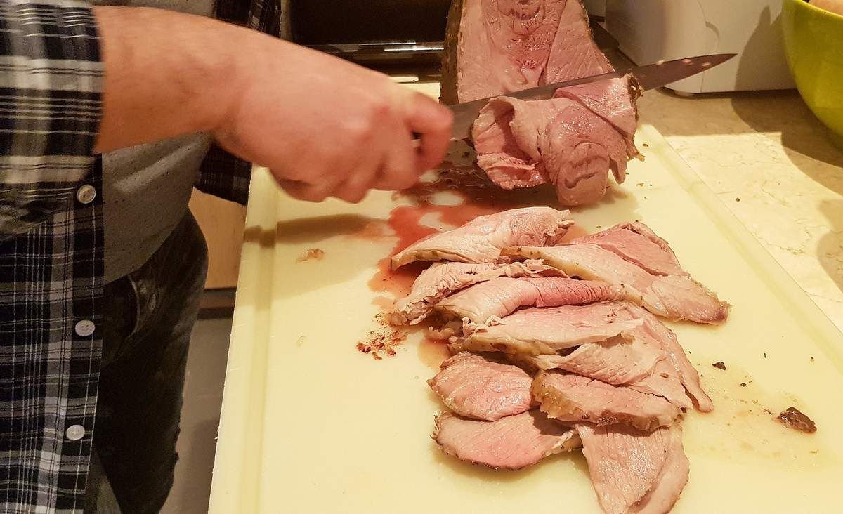 8) Lorsque le gigot atteint 60°C à coeur, le sortir du four et le découper en tranches fines, comme ça: