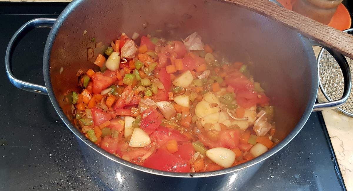 6) Dans la même casserole, remettre un peu d'huile d'olive à chauffer et faire revenir les carottes, le céleri et l'oignon une à deux minutes puis déglacer avec 1dl d'eau et bien gratter le fond avec une spatule pour décoller les sucs. Ajouter la tête d'ail coupée en deux, la feuille de laurier, les grains de poivre, une petite pincée de sel (pas plus car le jus va devenir salé en réduisant), le persil et la tomate coupée en morceaux. Ajouter 1,5 litre d'eau et remettre la viande dans la casserole. Porter à ébullition. A ébullition, baisser sur feu doux à frémissements et laisser réduire de moitié pendant environ 1 heure.