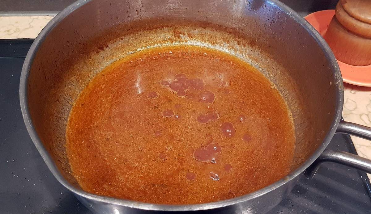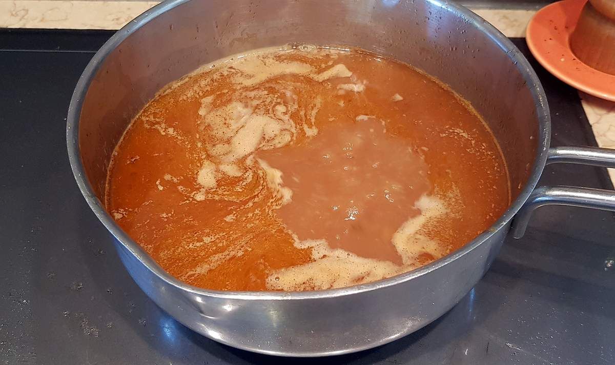 7) Lorsque le jus a réduit de moitié, le passer à travers un chinois pour le filtrer et le remettre dans la casserole. Le laisser encore réduire et épaissir environ 1 heure (plus ou moins), de façon à ce qu'il se concentre (aussi bien que vous). La quantité qu'il restera est d'environ 2dl. Goûter et rectifier l'assaisonnement en sel si nécessaire.