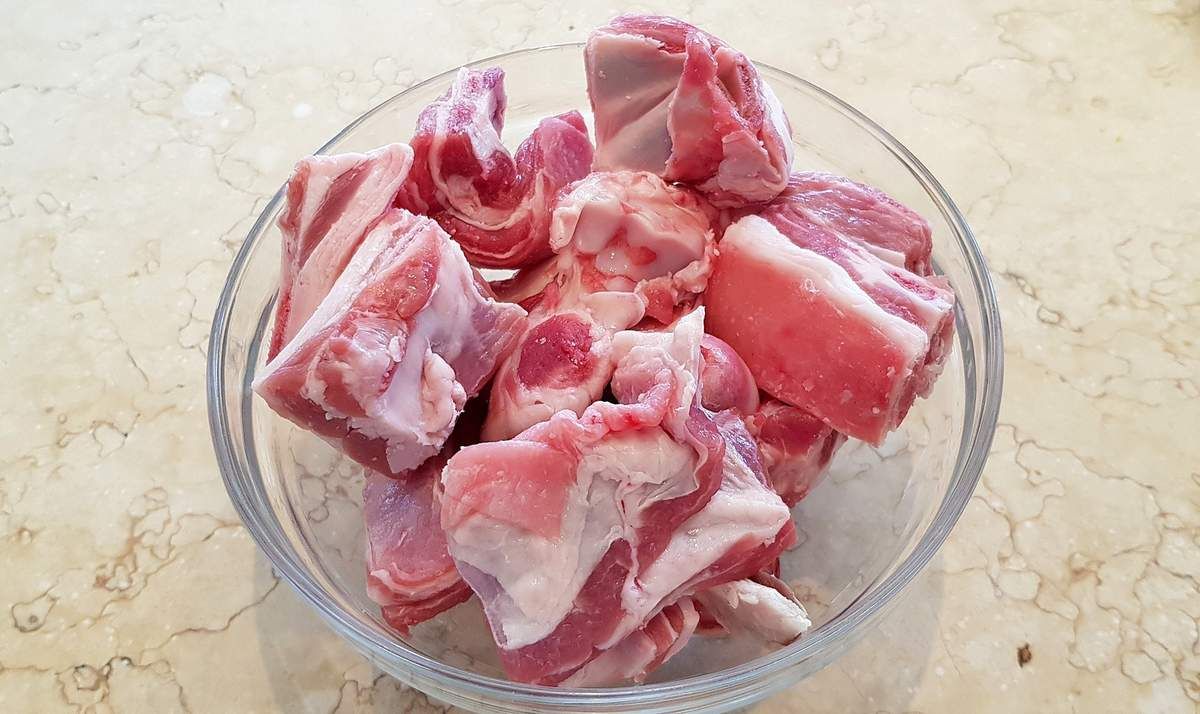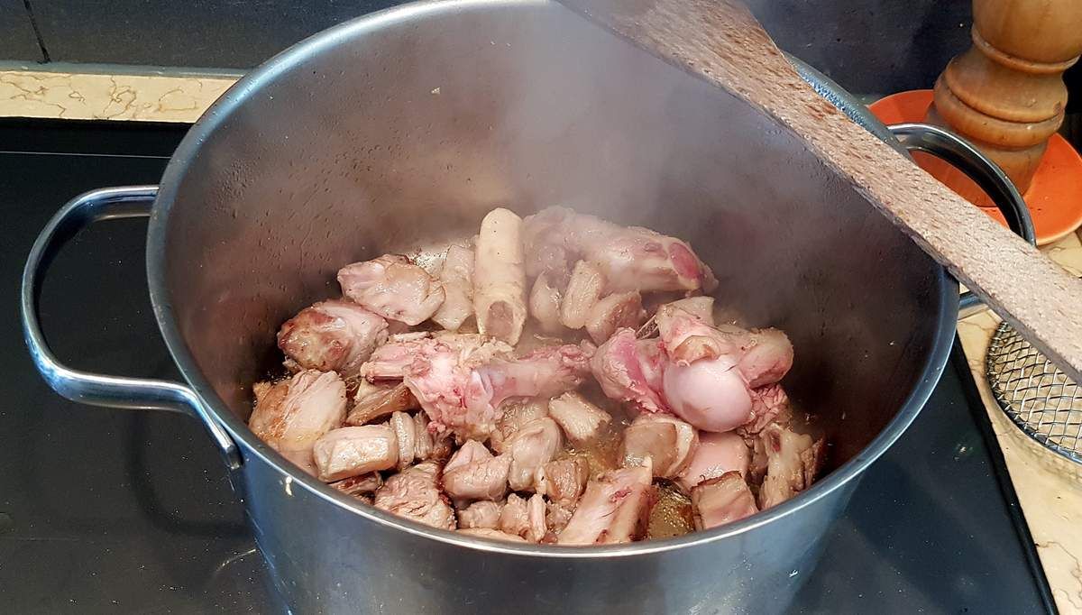 5) Dans une casserole, mettre à chauffer un filet d'huile d'olive et faire revenir les morceaux d'agneau sur feu vif (ne pas mélanger au tout début pour que les sucs se forment) pendant quelques minutes. Réserver la viande dans un récipient. Retirer le gras rendu par l'agneau, mais laisser les sucs.