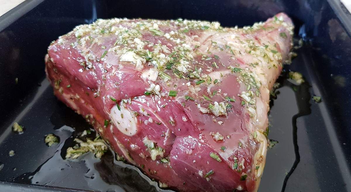 2) Badigeonner le gigot de toutes parts avec un pinceau à pâtisserie ou avec les mains. Le laisser mariner au moins une heure à température ambiante (idéalement 2 heures) dans un plat allant au four.