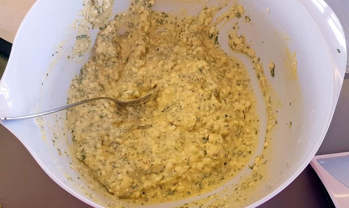 2) Dans un grand récipient, casser les œufs et fouetter un peu. Hacher la menthe et l’aneth et ajouter. Emietter le fromage et ajouter. Ajouter également la laitue et les oignons nouveaux. Bien mélanger, saler et poivrer.