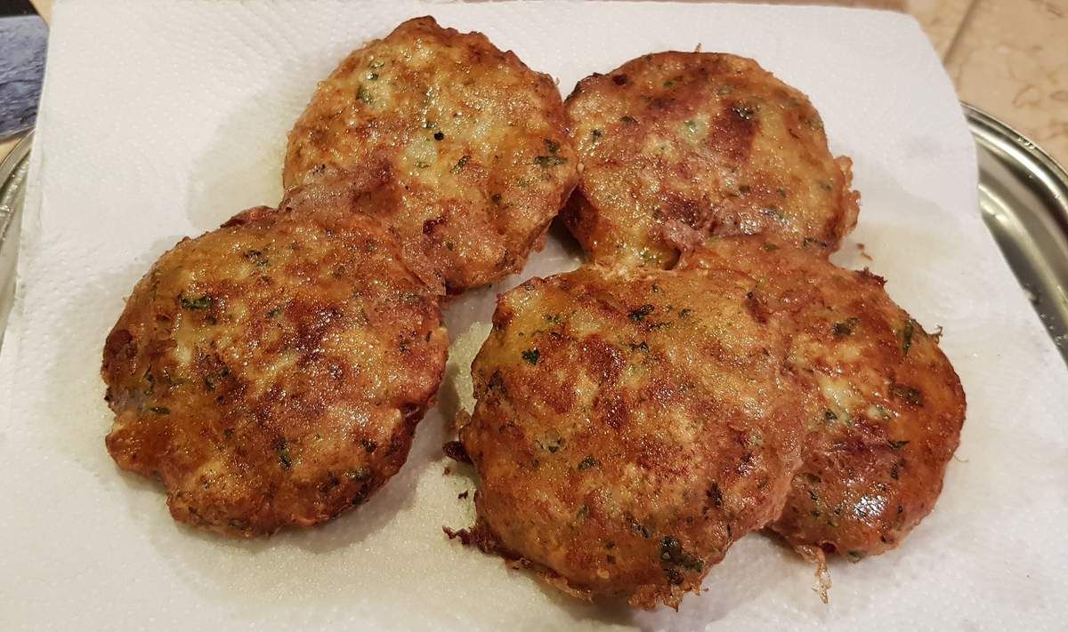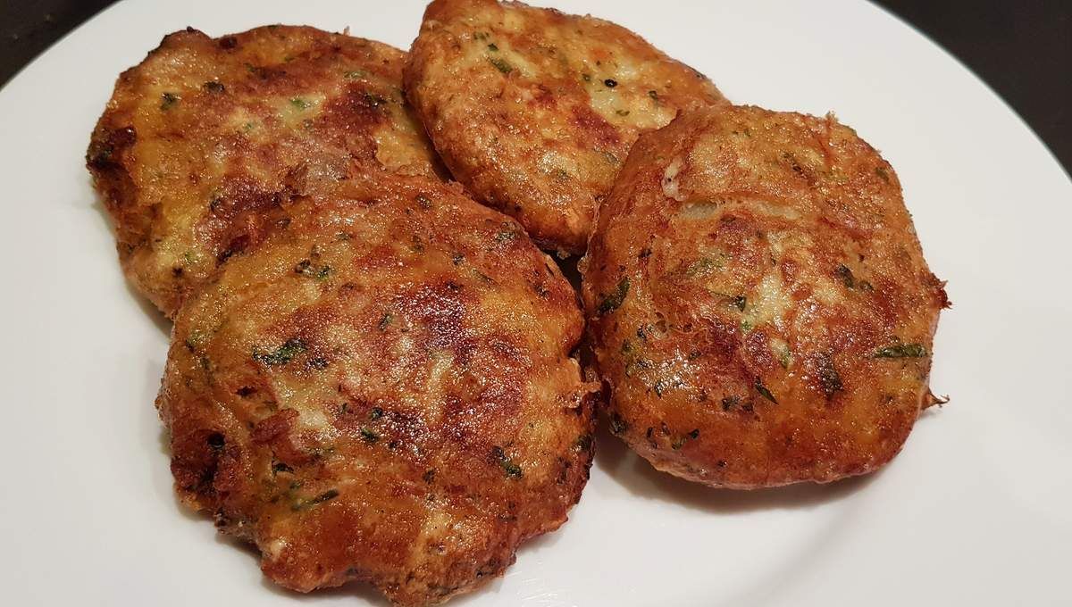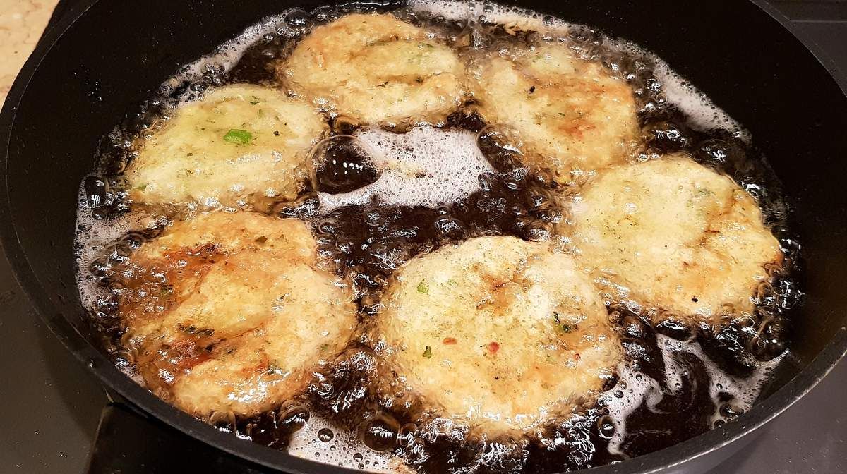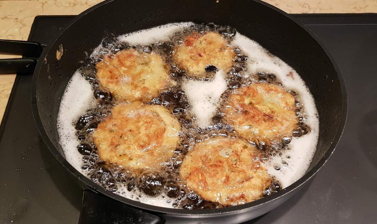 4) Faire chauffer un bon fond d’huile de friture dans une poêle. Battre les deux œufs restants dans une assiette creuse. Passer les galettes l’une après l’autre dans l’œuf et les faire frire directement quelques minutes de chaque côté. Egoutter sur du papier ménage et servir.