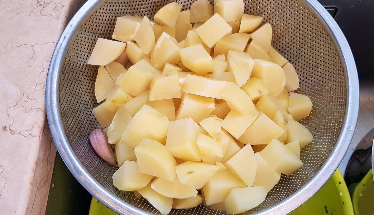 1) Peler les pommes de terre, les passer sous l’eau froide puis les couper en morceaux. Les mettre dans une casserole et les recouvrir d’eau. Ajouter les gousses d’ail entières avec la peau. Porter à ébullition et faire cuire 20 minutes environ jusqu’à ce que les pommes de terre soient tendres. Les égoutter puis les remettre dans la casserole à feu moyen une minute pour bien les sécher. Extraire la pulpe des gousses d’ail et jeter la peau.
