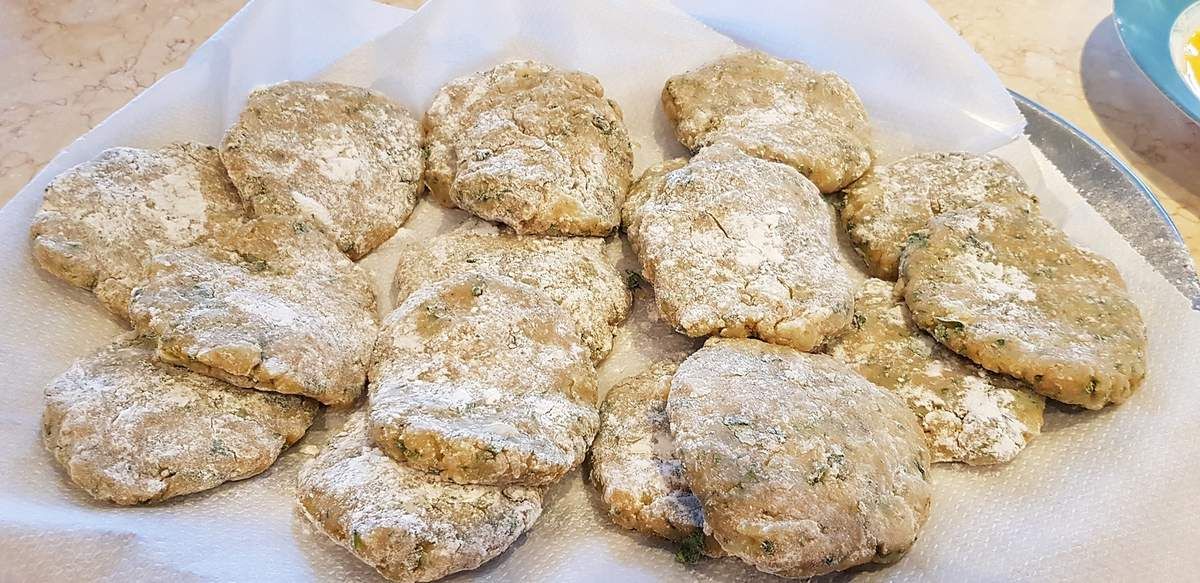 3) Ciseler les herbes et ajouter. Ajouter deux oeufs entiers. Saler (1 bonne càc) et poivrer.  Mélanger. Avec les mains légèrement humides, façonner des galettes et les passer dans la farine. Les disposer sur un plat recouvert de papier sulfurisé.
