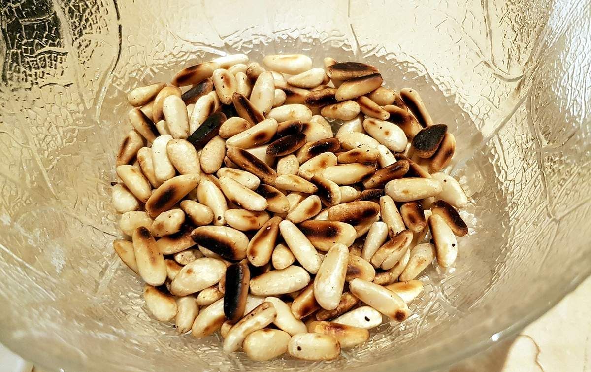 2) Couper la poire en dés après avoir retiré le centre (laisser la peau pour la couleur dans l'assiette). Torréfier dans une poêle sans matière grasse les pignons quelques minutes sur feu moyen et réserver. Couper le reste du fromage réservé en tout petits cubes.
