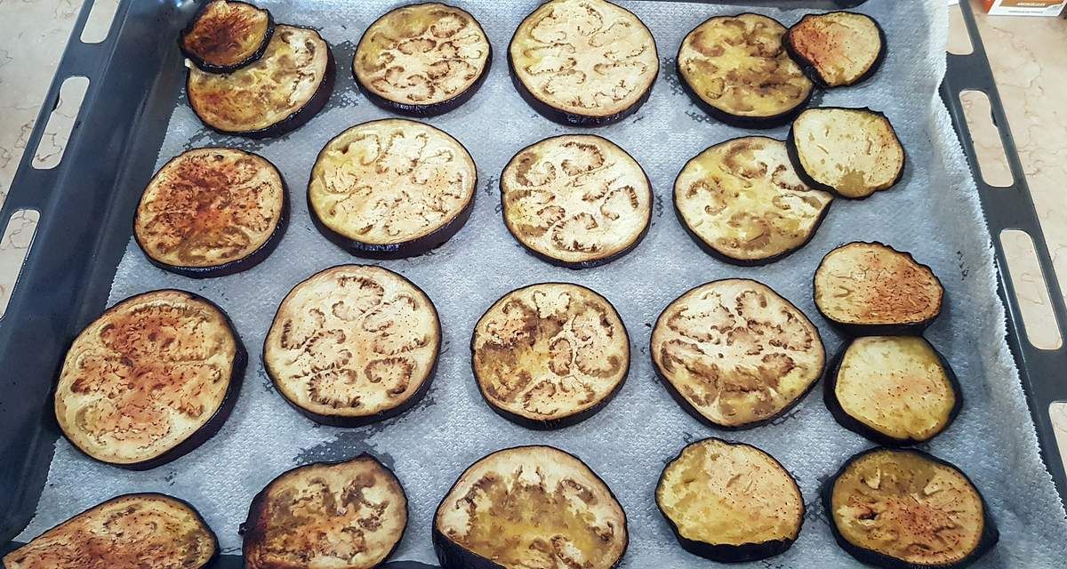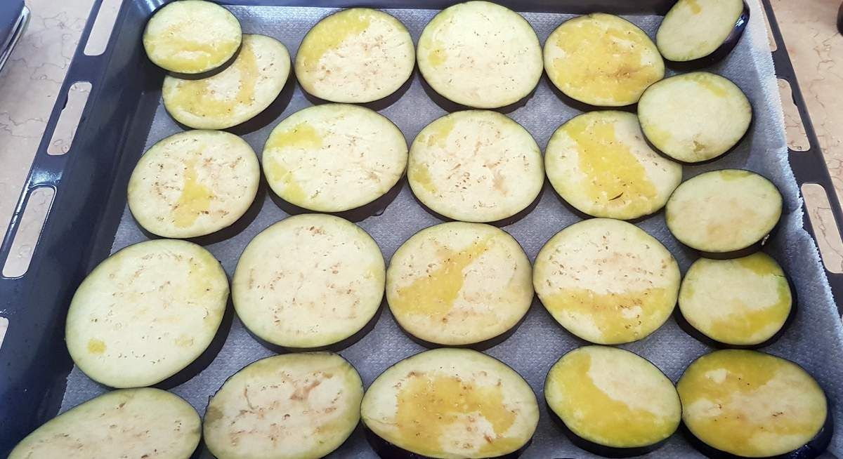 1) Préparer les aubergines : Préchauffer le four à 200°c. Passer les aubergines sous l’eau froide et les essuyer. Couper les extrémités puis les couper en rondelles d'environ 1 cm. Les mettre dans un saladier puis arroser avec un peu d’huile d'olive. Bien mélanger le tout avec les mains pour que les tranches s’imprègnent bien. Sur deux (même trois) plaques recouvertes de papier sulfurisé, disposer les rondelles côte à côte. Enfourner pour 30 à 40 minutes jusqu’à ce qu’elles soient tendres et dorées (pas noires). Vérifier la cuisson en plantant la lame d'un couteau dans une rondelle. Sortir du four.