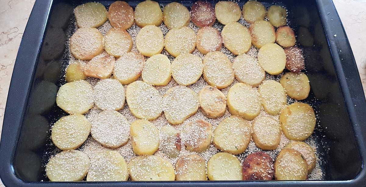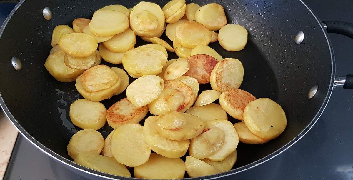 3) Préparer les pommes de terre : Les peler puis les passer sous l’eau froide. Les essuyer et les couper en rondelles épaisses. Dans une poêle, les faire revenir dans un filet d’huile d’olive en mélangeant souvent pendant 15 minutes environ jusqu’à ce qu’elles soient cuites et dorées. Saler un peu. Sortir de feu et laisser tiédir.