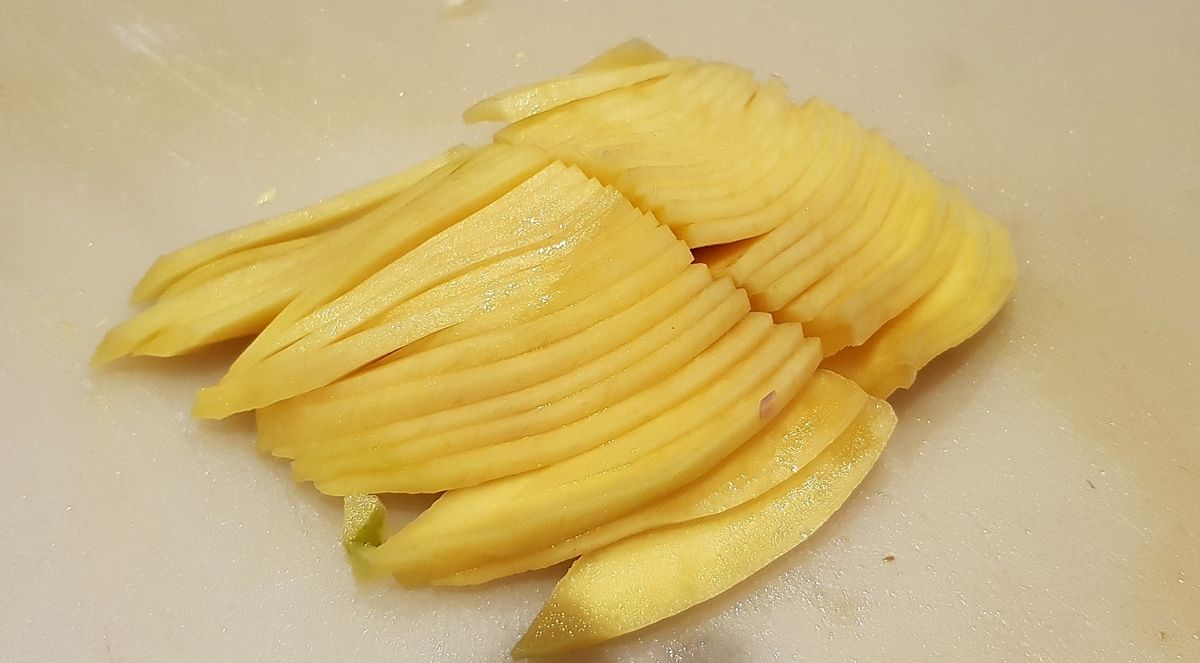 2) Peler la mangue avec un économe puis la couper en deux en passant autour du noyau. Découper chaque moitié finement en éventail puis en deux.