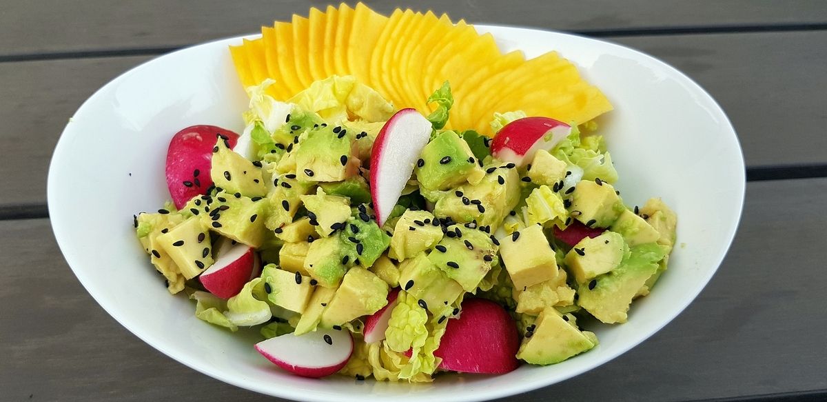 5) Juste avant le service, dresser les salades dans de jolis bols individuels. Déposer en premier lieu le chou, puis les radis, et les dés d'avocat. Sur un côté, déposer un éventail de mangue. Parsemer de quelques graines de sésame noir. Servir ainsi, la vinaigrette à part, pour que chacun puisse en mettre à sa guise et mélanger sa salade!