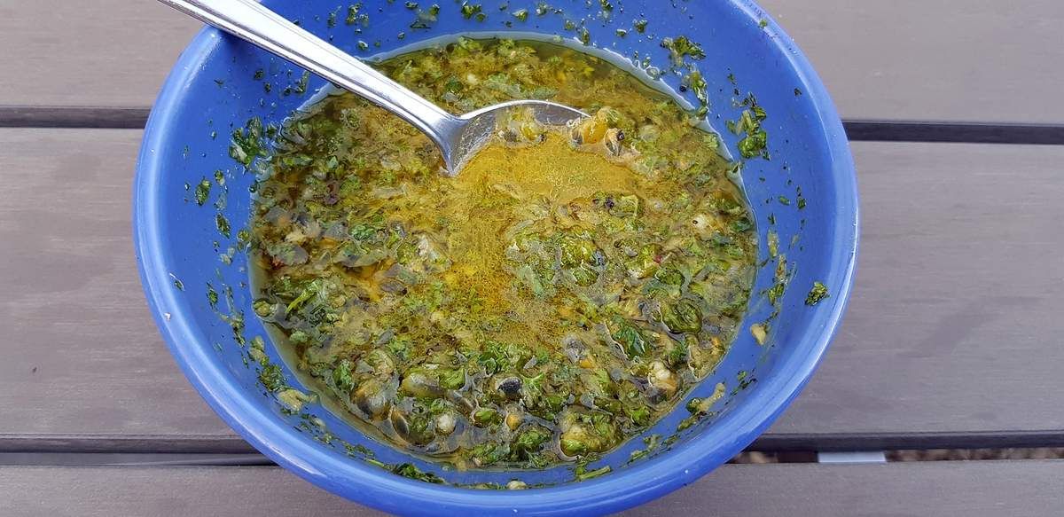 4) Préparer la vinaigrette: dans un bol, mettre le persil haché finement. Couper les fruits de la passion en deux et retirer la pulpe avec une cuillère. Mettre la pulpe dans le bol. Ajouter le jus de citron vert, la gousse d'ail pelée et passée au presse-ail, le gingembre pelé et râpé finement et l'huile d'olive. Saler, poivrer et mélanger. Ajouter un peu d'huile d'olive si la vinaigrette semble trop épaisse.