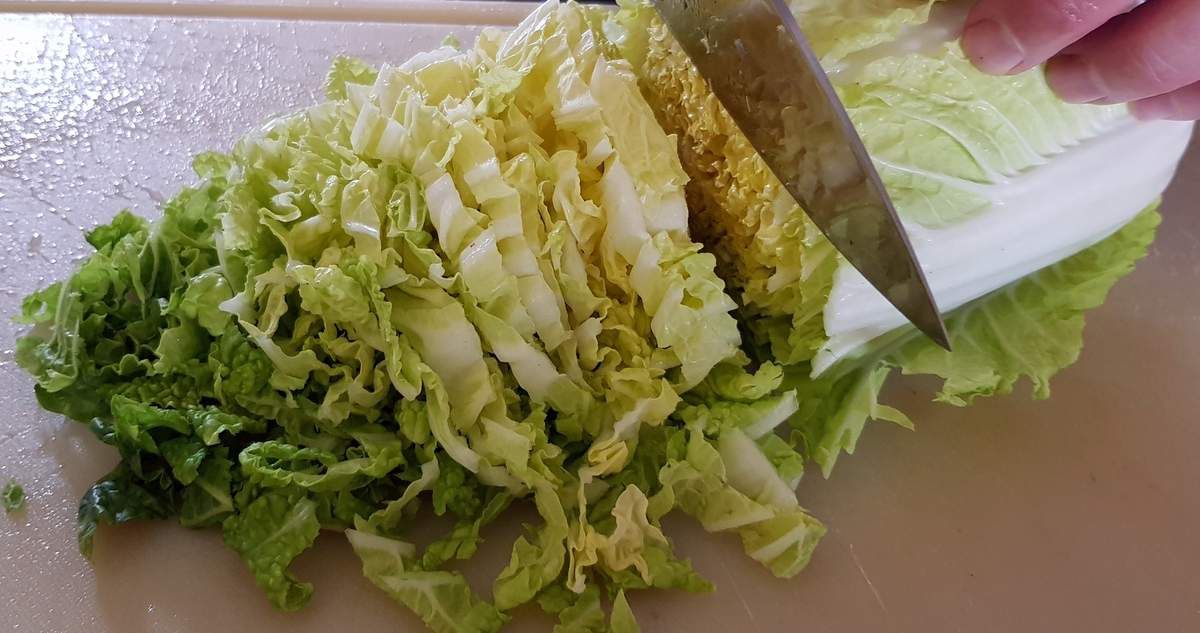 1) Couper le chou chinois en lanières, le passer sous l'eau froide et le laisser égoutter dans une passoire.