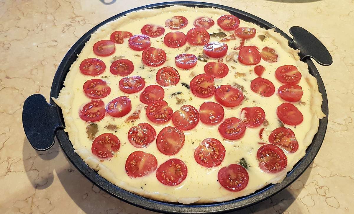 7) Déposer le mélange aux légumes sur la pâte. Verser la liaison délicatement. Répartir les moitiés de tomates cherry sur la quiche.