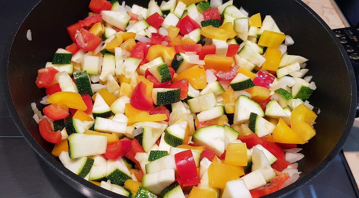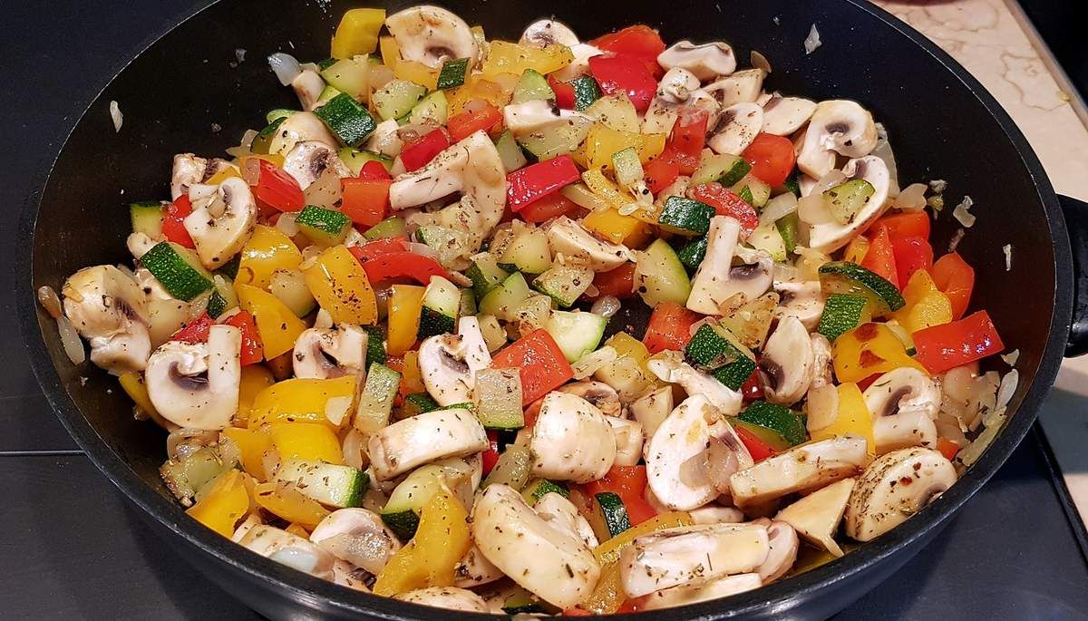 3) Dans une poêle haute, mettre à chauffer un filet d'huile d'olive et faire revenir l'oignon et l'ail une minute. Ajouter les dés de courgettes et de poivrons. Mélanger et faire revenir 5 minutes. Ajouter les champignons. Saler, poivrer et saupoudrer d'un peu d'herbes de Provence. Mélanger et cuire 15 minutes. Egoutter les légumes cuits dans une passoire et réserver. Préchauffer le four à 200°c.