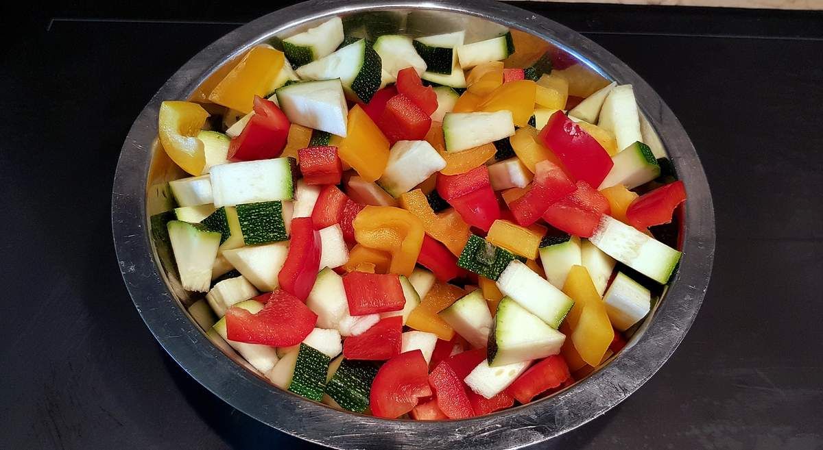 2) Laver les poivrons et la courgette sous l'eau froide. Couper les extrémités de la courgette, puis la couper en deux dans la longueur, puis en petits carrés. Couper les poivrons en deux, retirer le pédoncule et le centre blanc avec les pépins. Les couper en petits carrés. Essuyer les champignons avec du papier ménage pour enlever la terre. Couper l'extrémités des pieds puis couper les champignons en lamelles. Peler et hacher l'oignon et les gousses d'ail.
