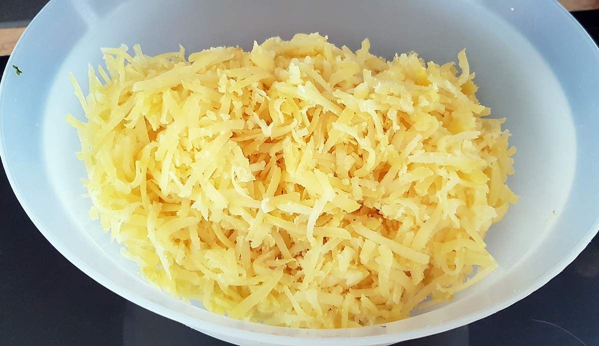 2) Le lendemain, peler les pommes de terre puis les passer à la râpe à rösti (râpe à gros trous). Donner quelques tours de moulin à poivre et saler (environ 1/2 càc). Mélanger délicatement avec les mains.