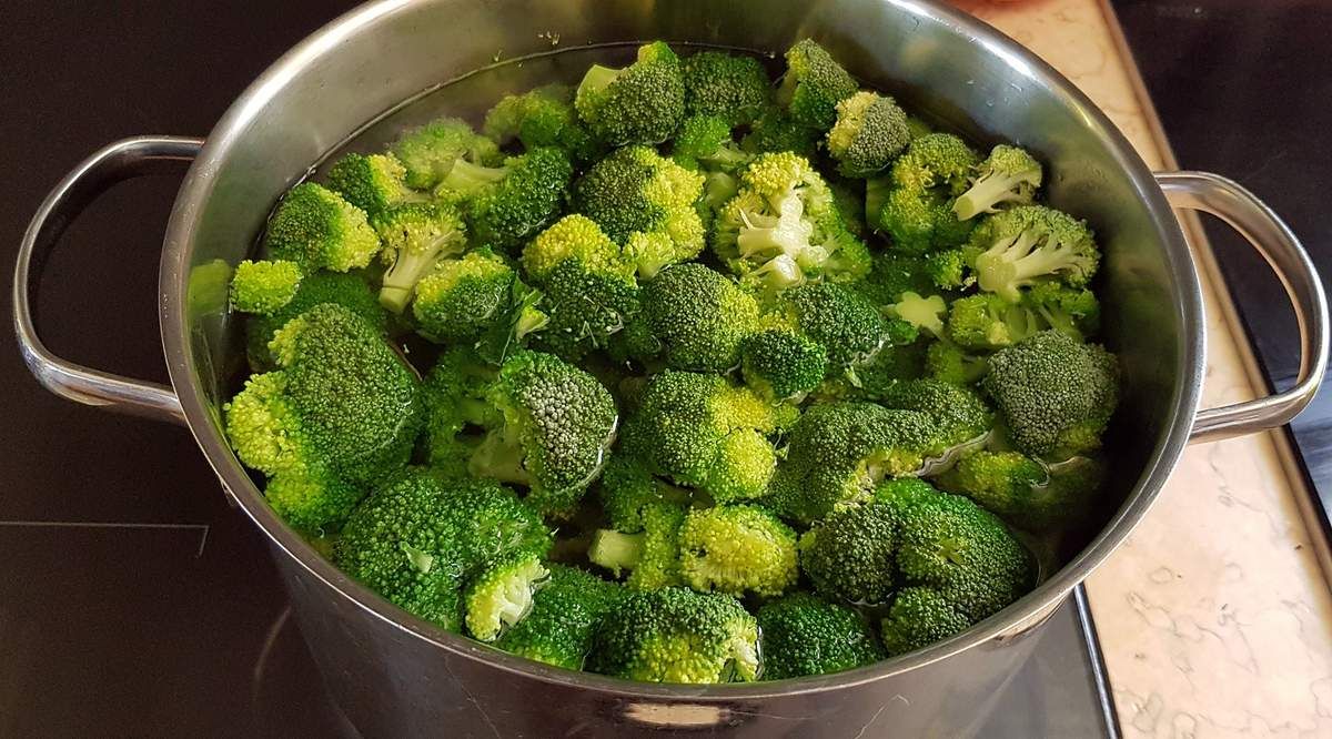 1) Passer les brocolis sous l'eau froide et couper les sommités (fleurettes). Faire bouillir de l'eau dans une casserole avec une cuillère à café de sel. A l'ébullition, plonger les sommités des brocolis, baisser le feu et laisser cuire 5 minutes. Le brocoli doit rester un peu croquant. Egoutter et bien rincer sous l'eau froide pour conserver la couleur.