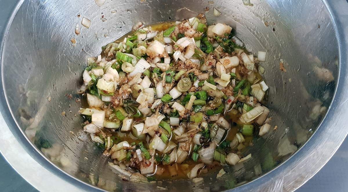 2) Préparer la vinaigrette: peler et hacher finement l'oignon rouge et mettre dans un bol. Ajouter la mayonnaise, l'huile d'olive, le vinaigre de vin blanc, les raisins secs et le sucre. Saler, goûter et rectifier l'assaisonnement.