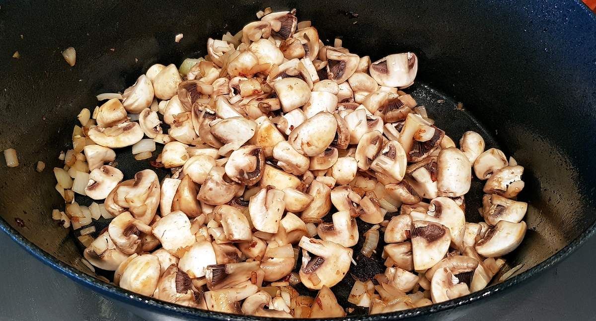 3) Dans le faitout, remettre un peu d'huile à rôtir à chauffer. Ajouter ail et oignon hachés ainsi que les champignons et faire revenir une minute. Ajouter la farine et bien bien mélanger.
