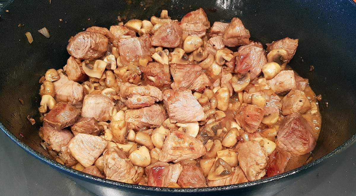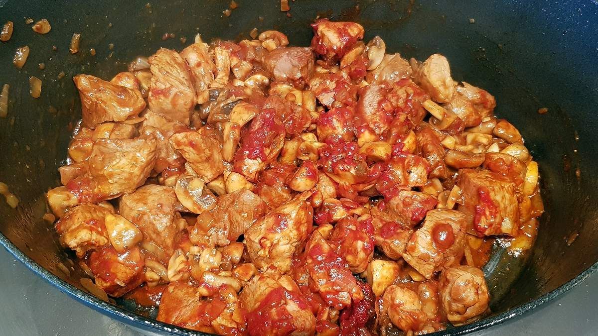 bonjour,<br /> par quoi peut on remplacer les champignons? je pensais à des poivrons mais du coup cuire plus longtemps avant de remettre la viande?