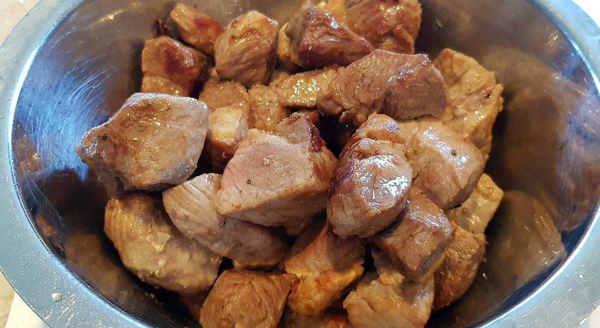 2) Dans un faitout, mettre à chauffer un filet d'huile ou de beurre à rôtir. Sur feu vif, faire revenir la viande. Eviter que les morceaux ne se superposent et laisser colorer sans mélanger quelques minutes, le temps que les morceaux forment une petite croûte. Puis mélanger et faire revenir encore quelques minutes jusqu'à ce que la viande soit dorée de toutes parts. Saler et poivrer. Réserver dans un récipient. Déglacer les sucs avec un peu d'eau en frottant le fond avec la spatule et mettre ce jus avec la viande.