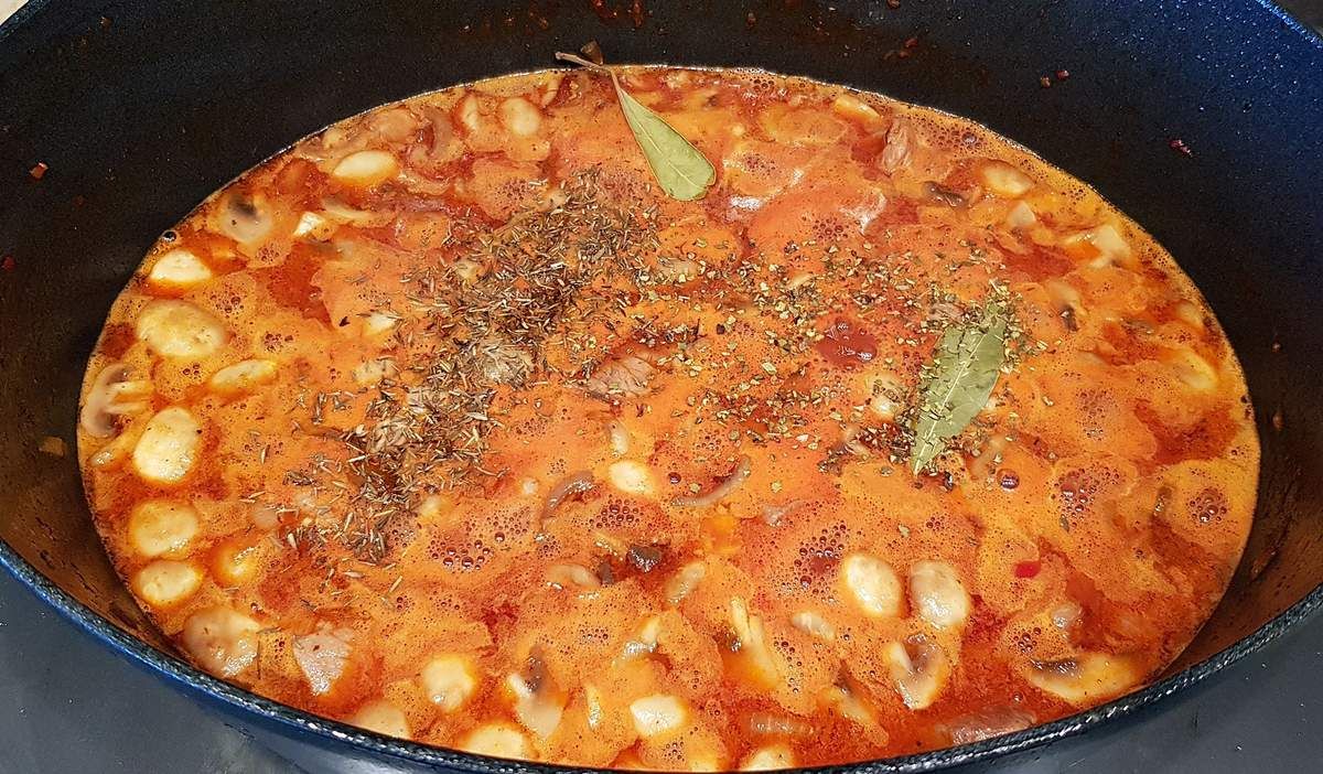 5) Ajouter le cube de bouillon de boeuf, le vin blanc, le laurier et quelques pincées de thym et d'origan séchés.