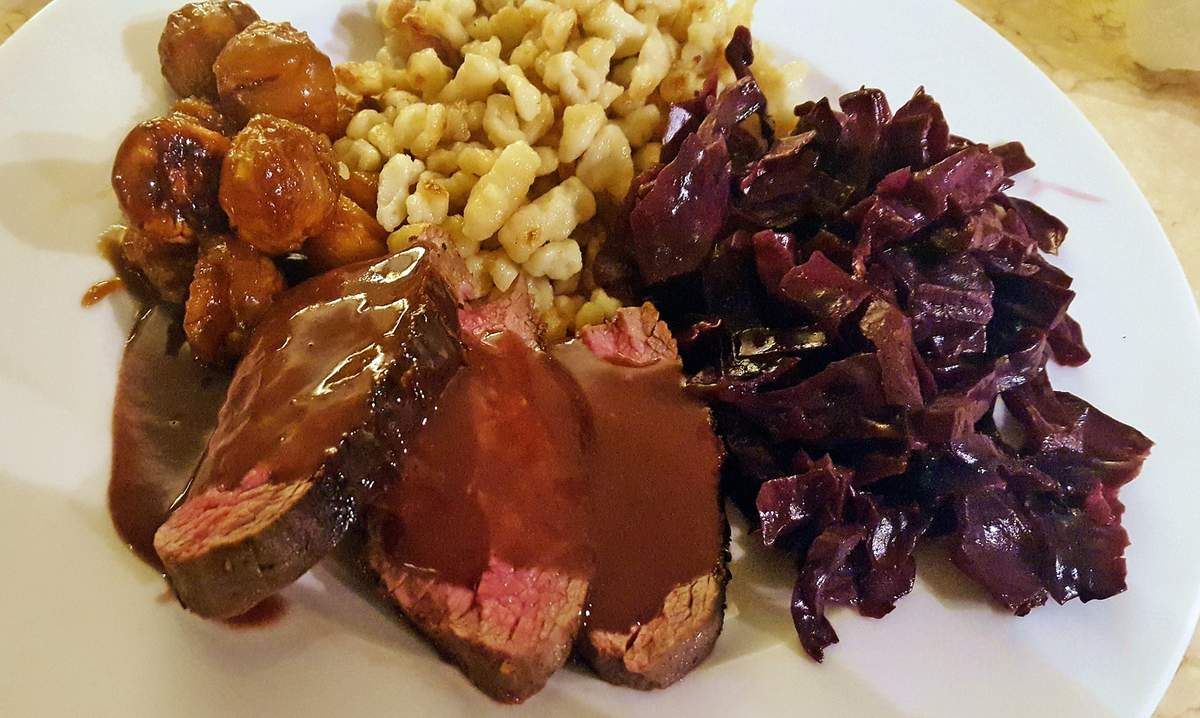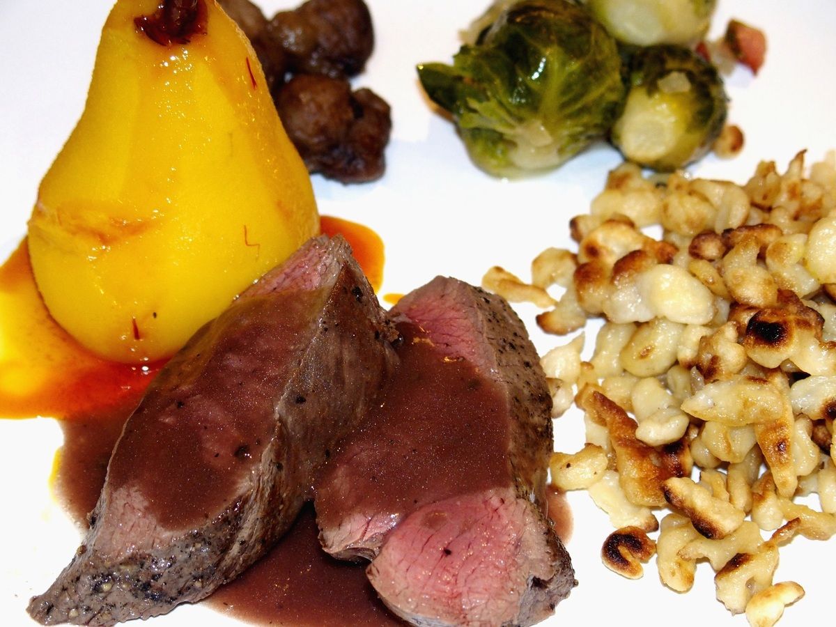 Quant aux garnitures, on part sur des choux rouges, des choux de Bruxelles aux lardons, des spätzlis maison, des poires safranées au miel et des marrons caramélises. Toutes les garnitures sont PAR LA!