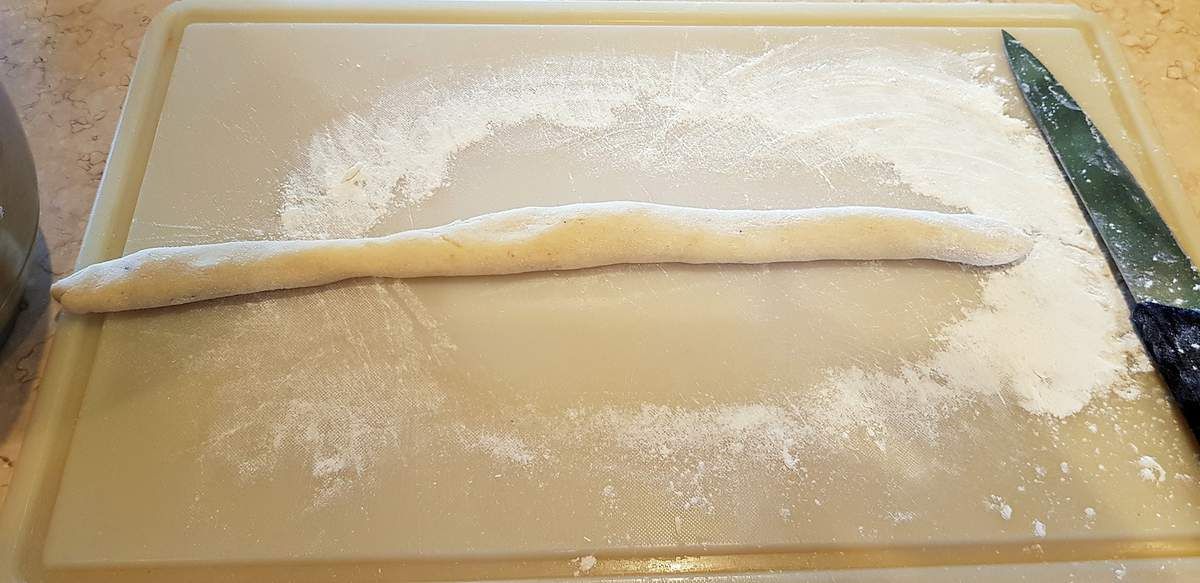 3) Fariner le plan de travail ou une grande planche. Prendre un peu de pâte et façonner un long boudin. Couper des tronçons de 3 à 4 cm. Façonner chaque tronçon en forme de Schupfnudeln, en le roulant sur le plan de travail (d'une longueur de 5 cm environ). Le centre est arrondi et les extrémités fines, étirées un peu en pointes. Fariner légèrement chaque pièce et réserver sur un plat. Répéter l'opération jusqu'à épuisement de la pâte.