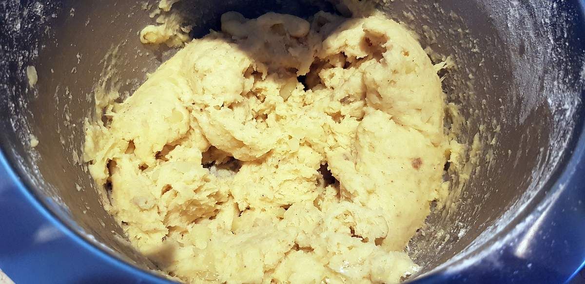 2) Dans le bol d'un robot ménager, mettre la farine, les oeufs, 2 cuillères à café de sel, un peu de poivre et de muscade. Mélanger grâce au crochet à moyenne vitesse ou mélanger soigneusement avec une spatule. Ajouter les pommes de terre écrasées et bien mélanger pour obtenir un mélange homogène.