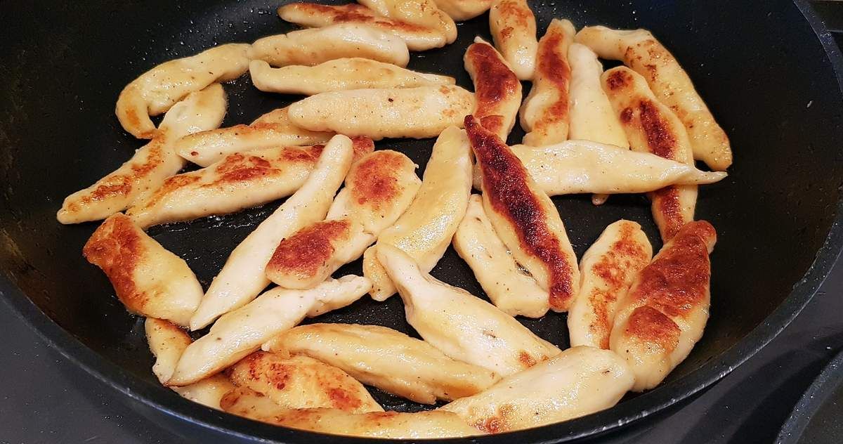 5) Mettre un bon morceau de beurre à fondre dans une poêle. Faire dorer les Schupfnudeln par portions si nécessaire, pour pas qu'ils ne se superposent, durant 10 à 15 minutes. Lorsqu'ils sont bien dorés et croustillants à l'extérieur, servir! Ou les réchauffer au dernier moment avec un peu de beurre dans la poêle.