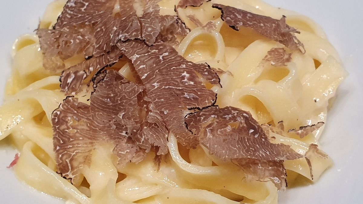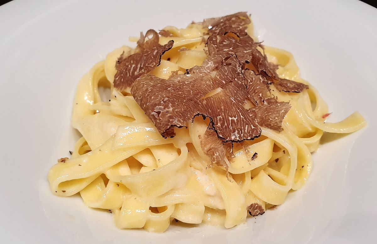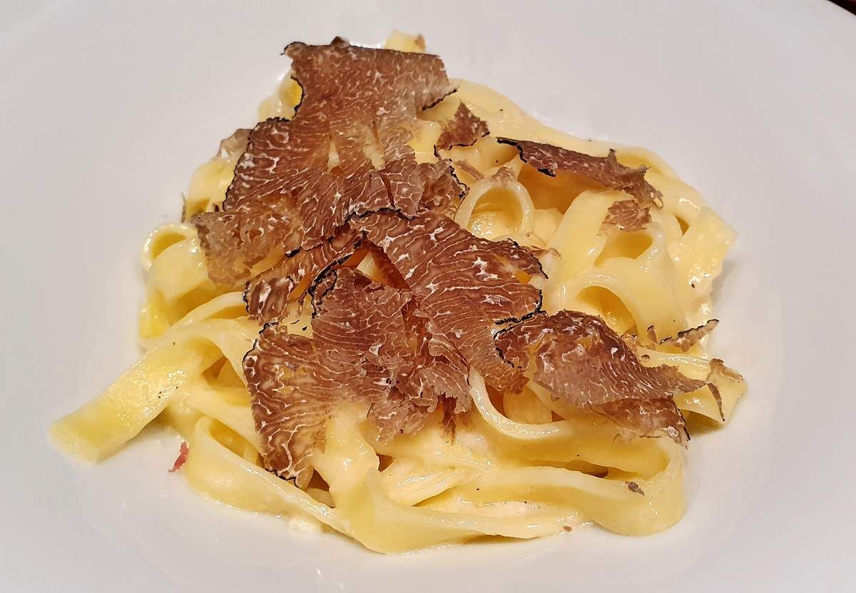 Des tagliatelle cuites al dente, mélangées au service avec une sauce délicieuse faite de crème, de parmesan et de beurre. Et sur le dessus, des copeaux de truffe. C'est tout.