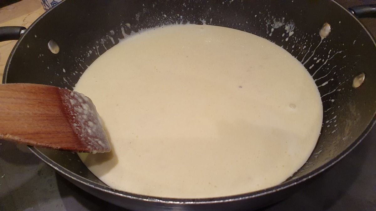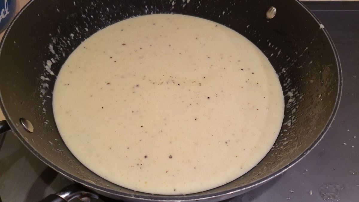 2) Parallèlement, faire fondre le beurre dans une poêle haute puis ajouter le parmesan. Ajouter une belle louche d'eau de cuisson des pâtes. Ajouter la crème et mélanger. Saler et poivrer. Goûter et rectifier l'assaisonnement. Laisser mijoter sur feu doux deux minutes, le temps que les pâtes soient cuites.