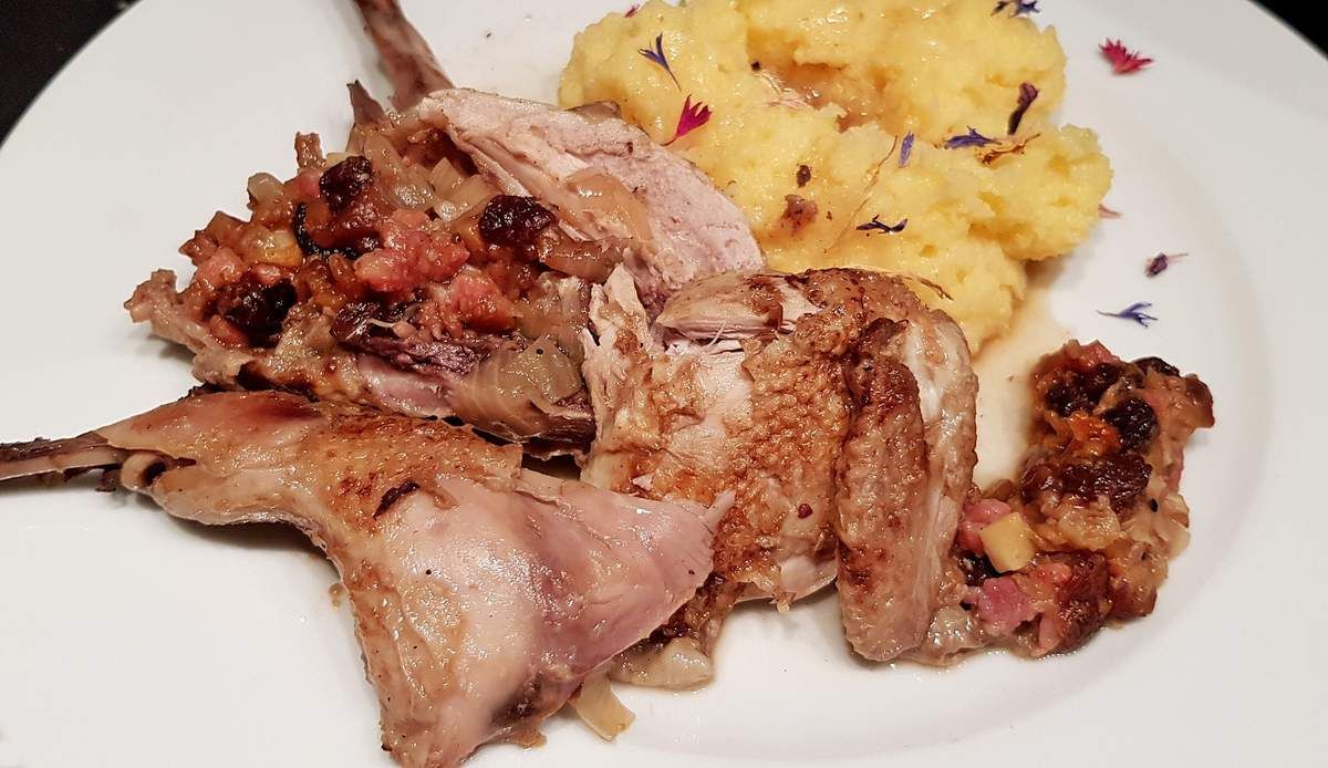 7) Pour servir, tirer sur les cuisses vers l'extérieur pour les détacher. Découper à la jointure au niveau du bréchet (os qui sépare les deux filets) pour décoller les blancs. Servir dans des assiettes avec la farce et un peu de jus. En accompagnement, une polenta, des pommes de terre, ce qui vous fait plaisir!