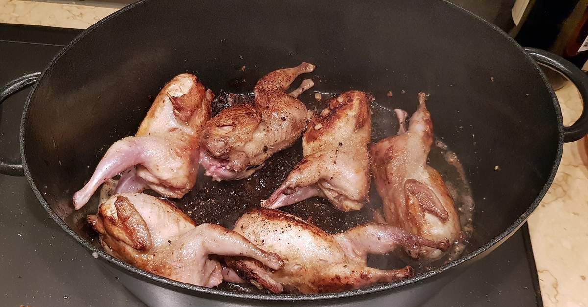 4) Dans une grande cocotte, faire revenir délicatement les cailles sur feu moyen vif dans un filet de beurre à rôtir de toutes parts jusqu'à ce qu'elles soient bien dorées. Cela prendra une dizaine de minutes. Saler et poivrer. Procéder en plusieurs fois si nécessaire, elles ne doivent pas se superposer. Réserver les cailles dans un plat.