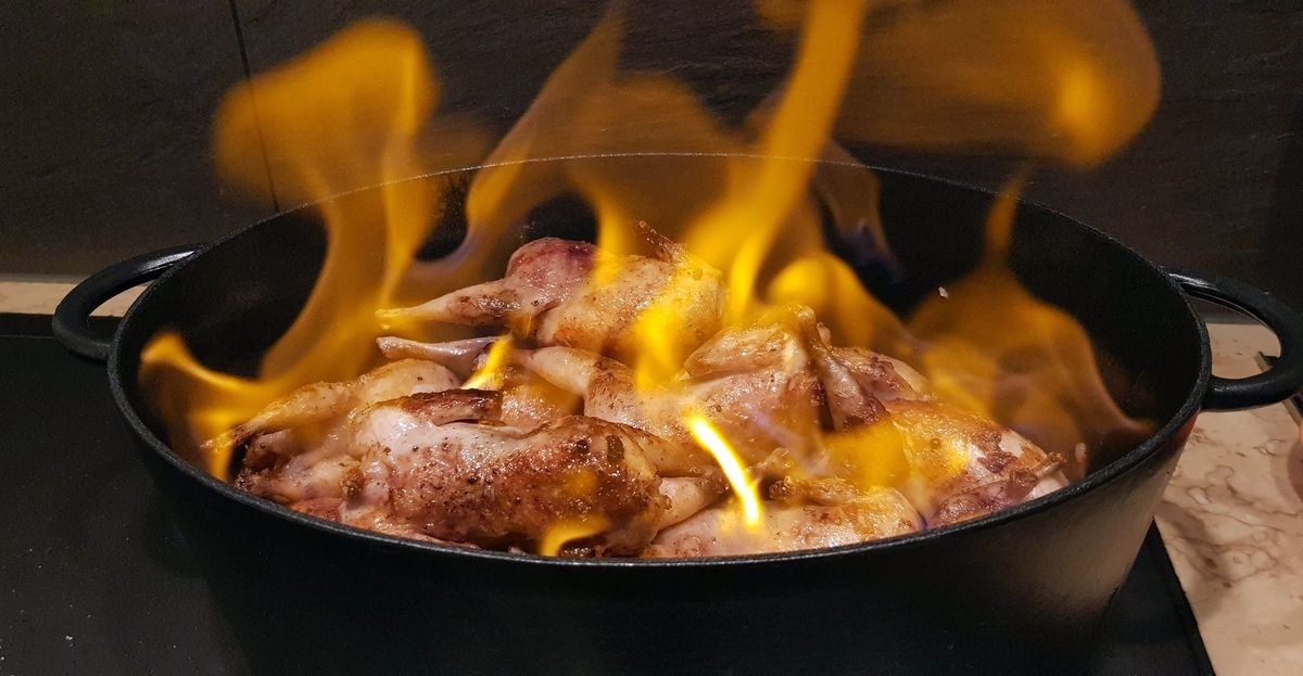 Allumer une grande allumette, verser le cognac dans la cocotte et flamber immédiatement. Laisser flamber sans toucher à la cocotte jusqu'à ce que toutes les flammes aient disparu !