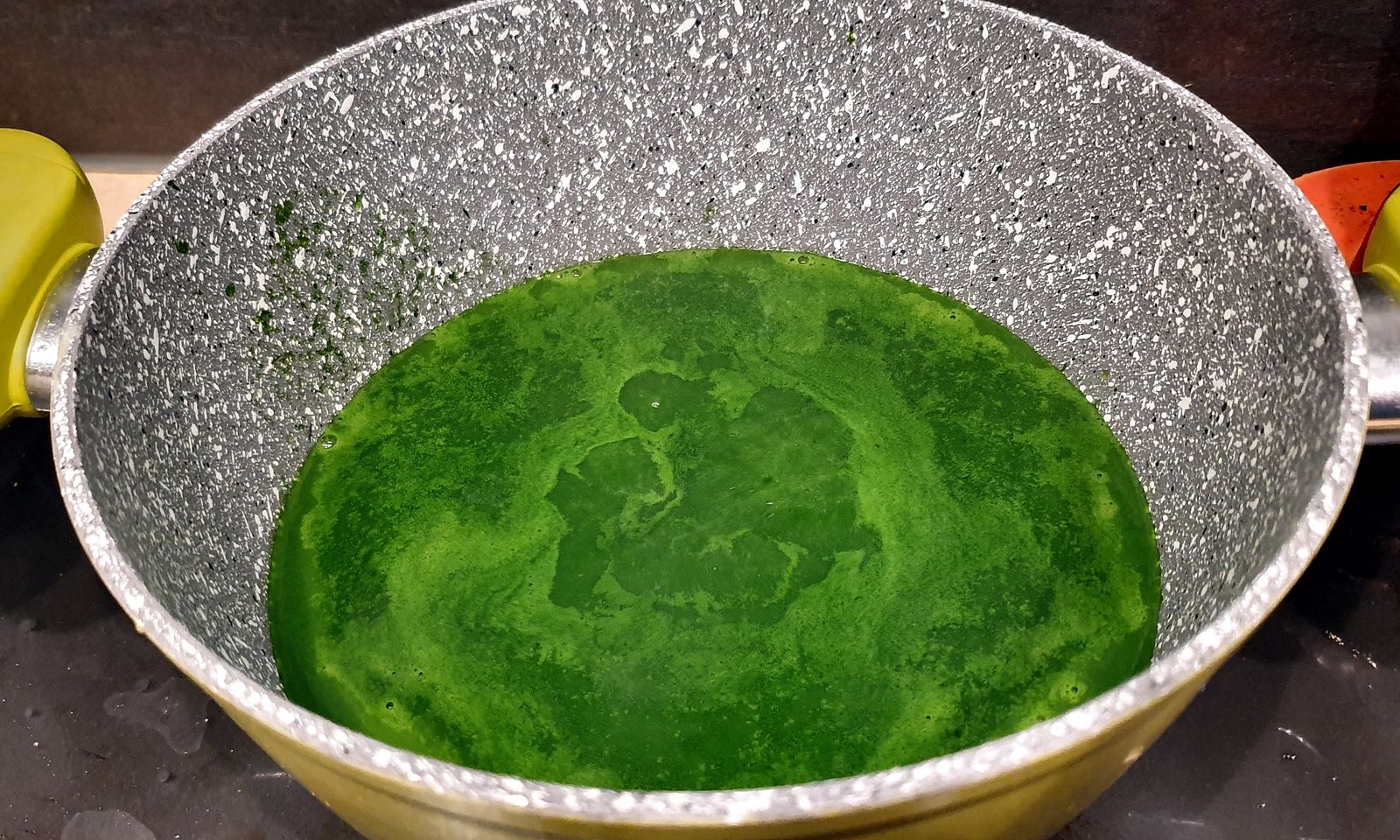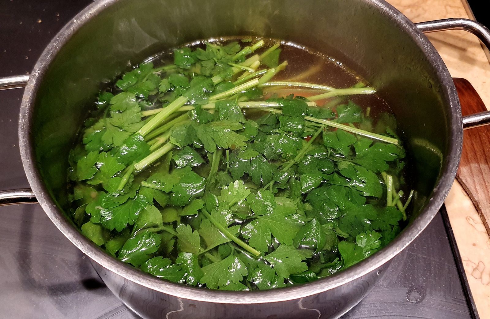 1) Préparer tout d'abord le jus de persil: passer le bouquet de persil sous l'eau froide et le couper très grossièrement, avec les queues. Plonger le persil dans une casserole d'eau (1, 5 litre) avec les deux cubes de bouillon puis porter à ébullition. Après 4 minutes de cuisson, égoutter le persil tout en conservant le bouillon car il sera utilisé plus tard. Rincer soigneusement le persil sous l'eau froide pour lui permettre de conserver une belle couleur. Essorer le persil entre les doigts et le mettre dans un récipient haut. Ajouter progressivement en mixant avec un plongeur environ 2 louches du bouillon. Le but est d'obtenir un jus finement mixé. Ensuite, passer ce jus au chinois pour qu'il ne reste que le liquide. Réserver dans une petite casserole.