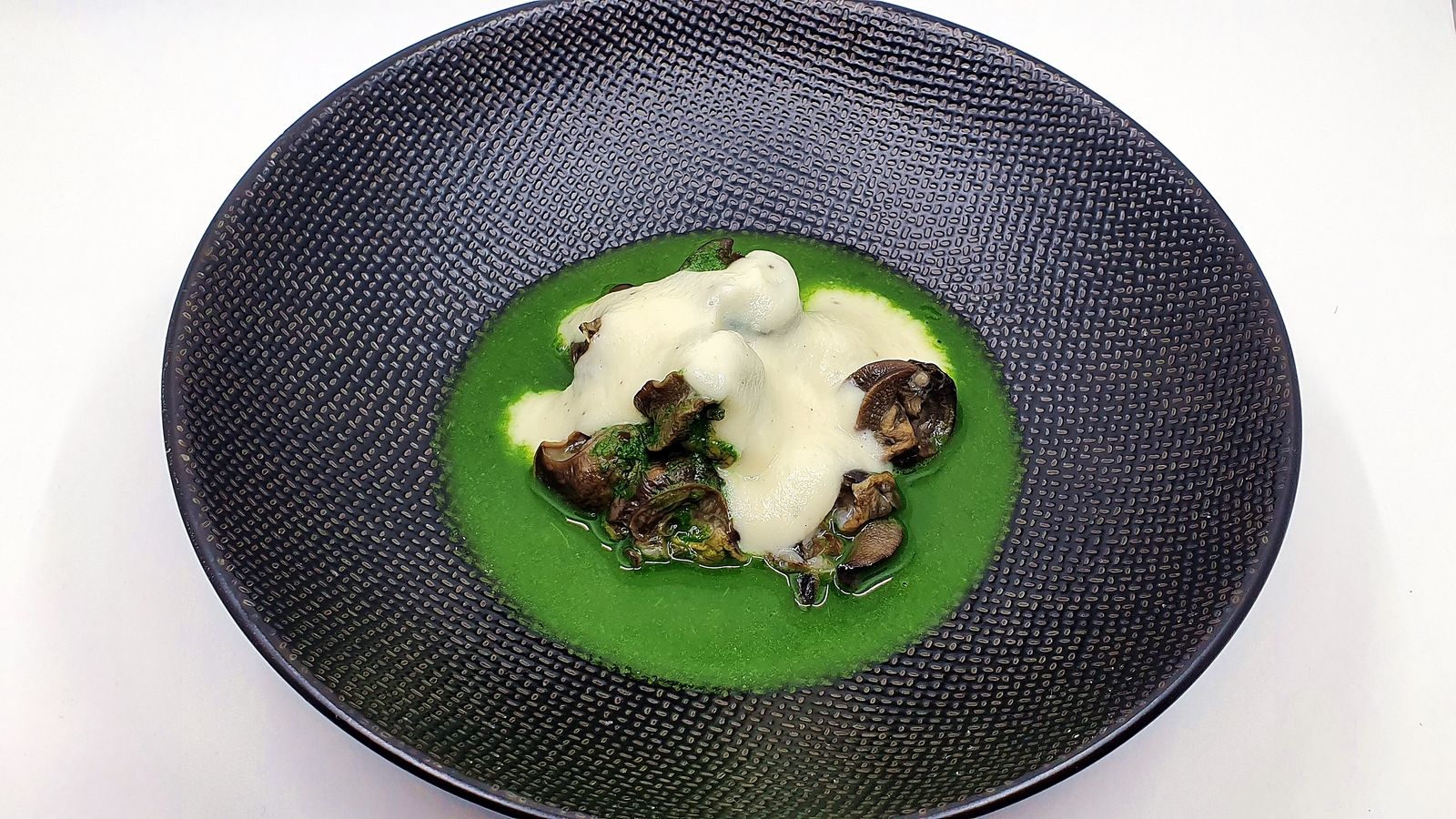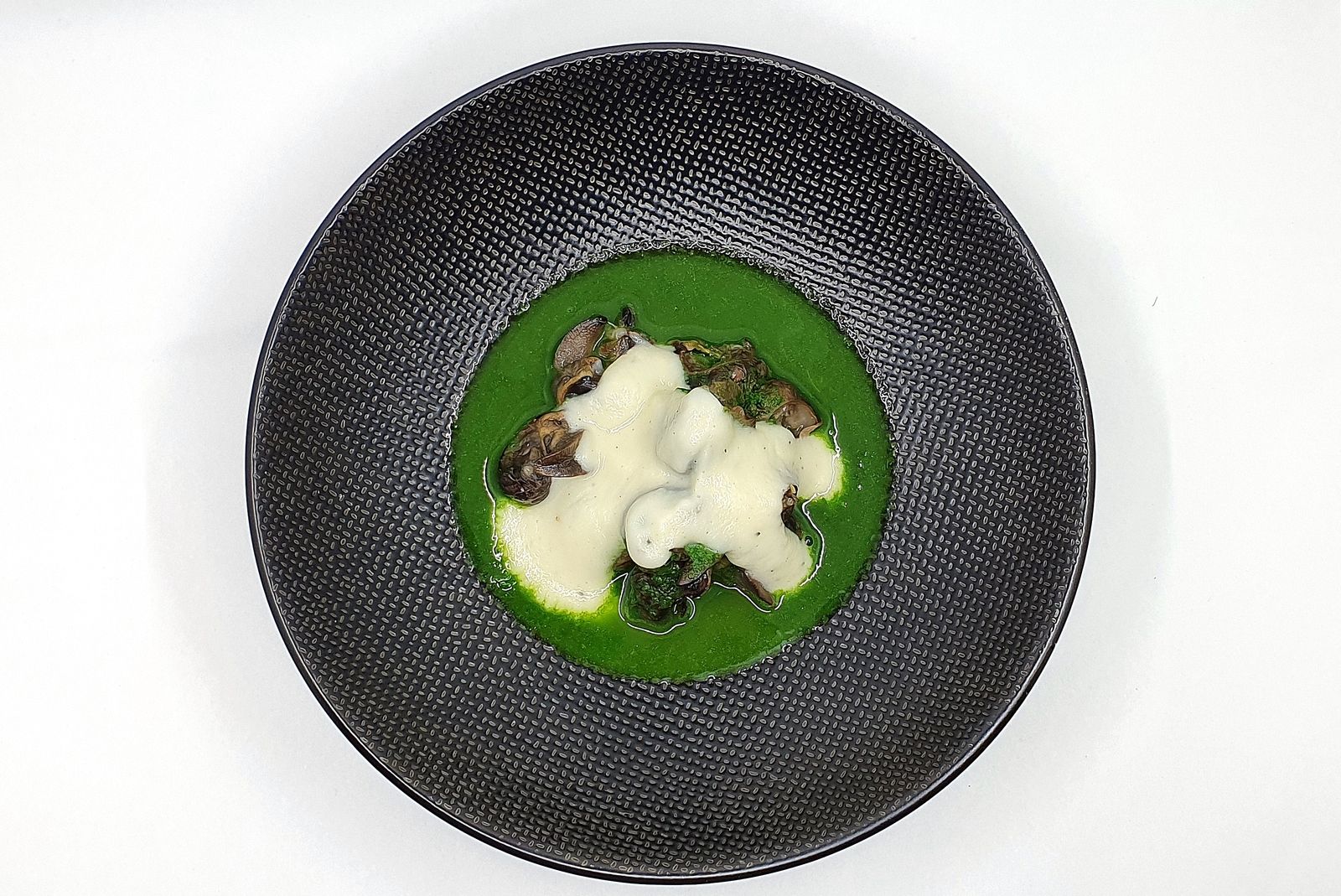 5) Dressage: dans une assiette creuse, déposer au centre les escargots. Verser délicatement environ une petite louche de jus de persil. Ajouter sur les escargots, au centre, environ 2 cuillères à soupe de crème d'ail, joliment. Servir de suite!