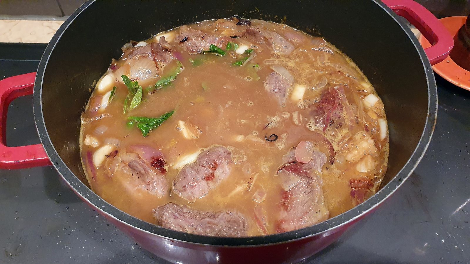 3) Dans le gras de la cocotte, faire revenir les oignons 5 minutes puis ajouter l'ail et faire revenir 2 minutes. Remettre la viande dans la cocotte. Ajouter le jus des oranges et le jus du citron vert. Ajouter le rhum blanc et 2 décilitres d'eau. Ajouter également la menthe et la coriandre en bouquet (donc entières), tout en en gardant un peu pour la déco. Saler et poivrer. Ajouter le cumin et le sucre de canne. Bien mélanger. Porter à ébullition puis baisser le feu sur feu doux. Couvrir la cocotte et laisser cuire une heure puis découvrir et laisser cuire encore une heure. Vérifier la cuisson de la viande qui doit être fondante. Retirer les herbes. Goûter et rectifier l'assaisonnement. Servir en parsemant de menthe et coriandre ciselée, avec du riz, par exemple, et des haricots noirs.