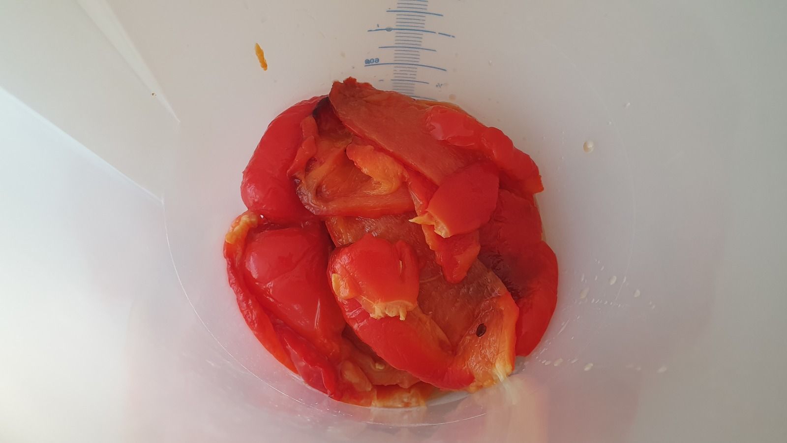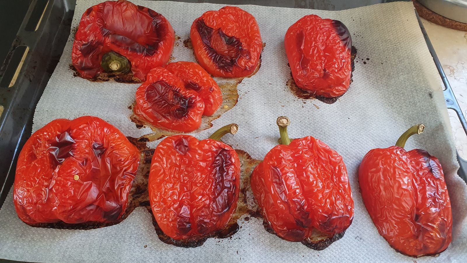 1) Passer les poivrons sous l’eau froide, les essuyer. Les couper en deux et les mettre sur une plaque recouverte de papier sulfurisé. Les cuire environ 30 à 40 minutes dans le milieu du four préchauffé à 200°C, jusqu’à ce que la peau noircisse un peu. Mettre les poivrons dans un saladier et recouvrir de papier film (ou les enfermer dans un sachet de congélation). Laisser les poivrons tiédir ainsi durant au moins 30 minutes. La peau se détachera alors facilement.