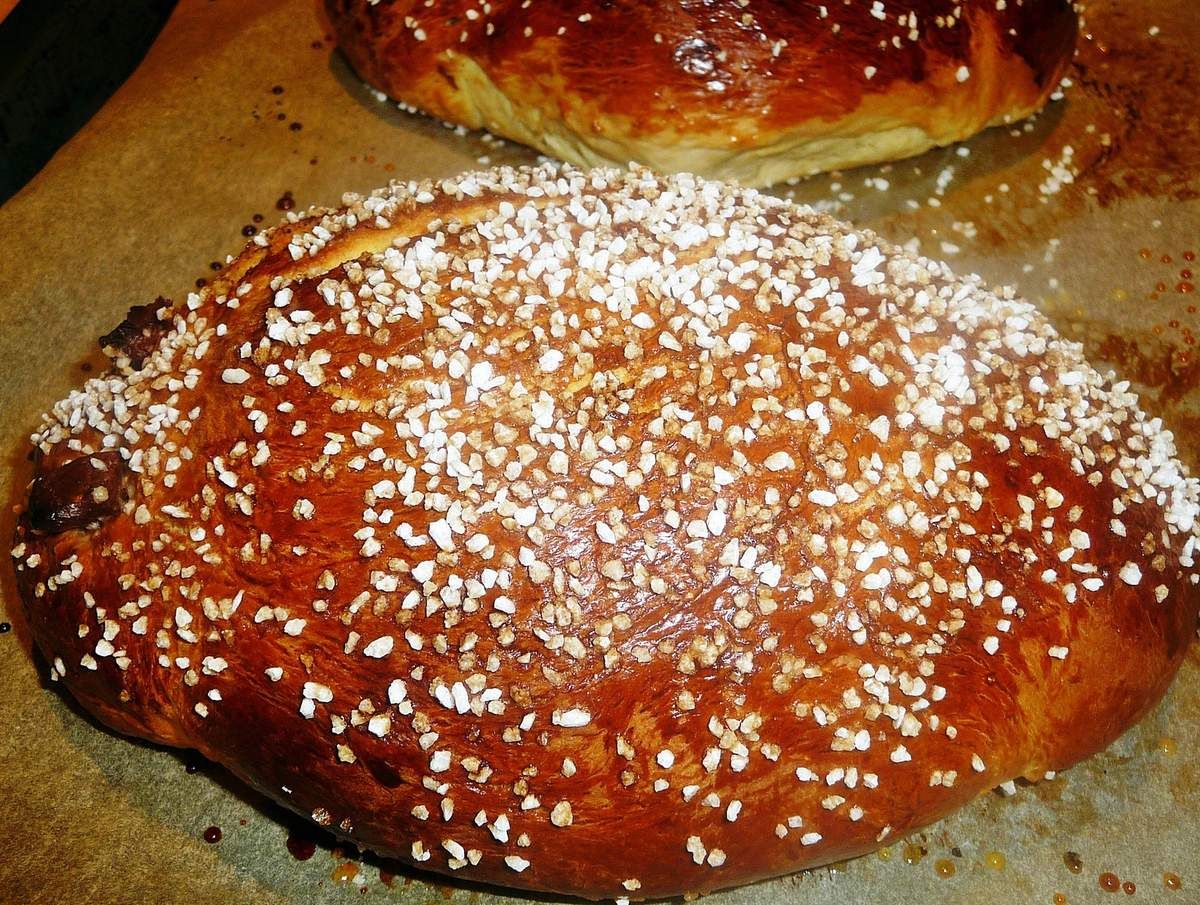 5) Badigeonner vos brioches avec un mélange de lait et de jaune d'oeuf à l'aide d'un pinceau. Parsemer généreusement de sucre perlé. Glisser vos brioches à mi-hauteur du four durant 20-25 minutes (pour 2 brioches de 500g) ou 35 minutes (pour une brioche d'un kilo). Vérifier la cuisson en tapotant le dessous de la brioche, cela doit sonner "creux"