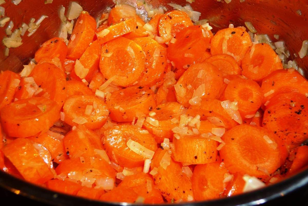 2) Dans une casserole, mettre à chauffer un filet de beurre à rôtir. Ajouter l'oignon et l'ail et faire revenir 2 minutes. Ajouter les carottes et faire revenir en mélangeant 2 minutes.