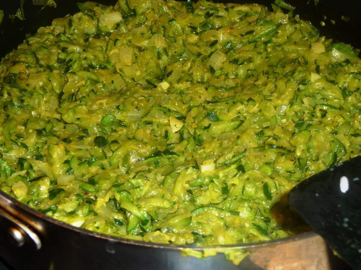 3) Dans une grande poêle, mettre à chauffer un filet d'huile d'olive. Ajouter l'oignon haché, l'ail coupé finement et faire revenir. Ajouter les courgettes, poivrer, ajouter une bonne pincée de paprika et du curry et émietter le bouillon. Faire revenir environ 15 minutes jusqu'à ce qu'elles aient rendu toute leur eau.
