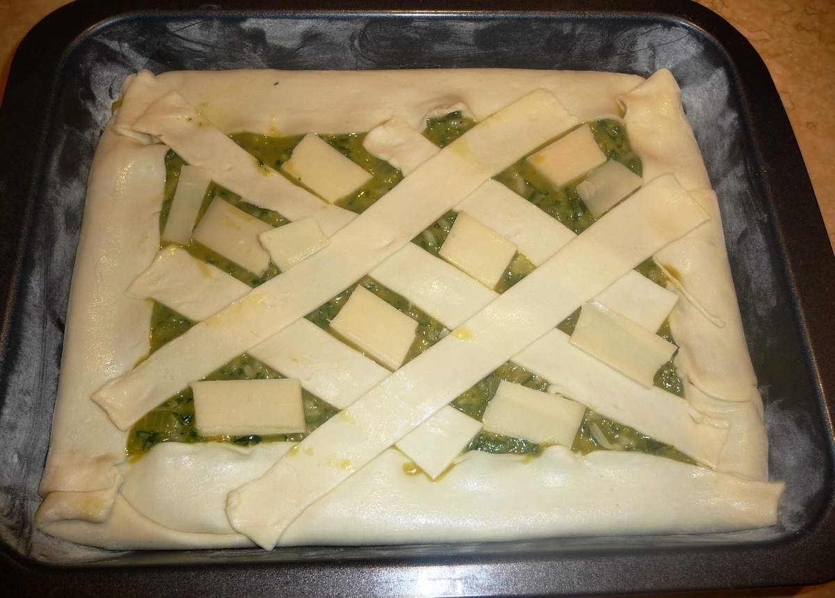 6) Préchauffer votre four à 200°C. Avec un petit couteau, couper la pâte sur le plat du moule et rabattre les bords sur la farce. Découper des languettes dans le reste de la pâte et déposer en croisillons sur la farce. Déposer des lamelles de gruyère dans les interstices. Tremper dans de l'eau froide un pinceau et badigeonner les lamelles de pâte.