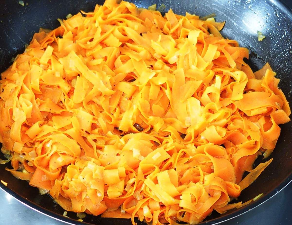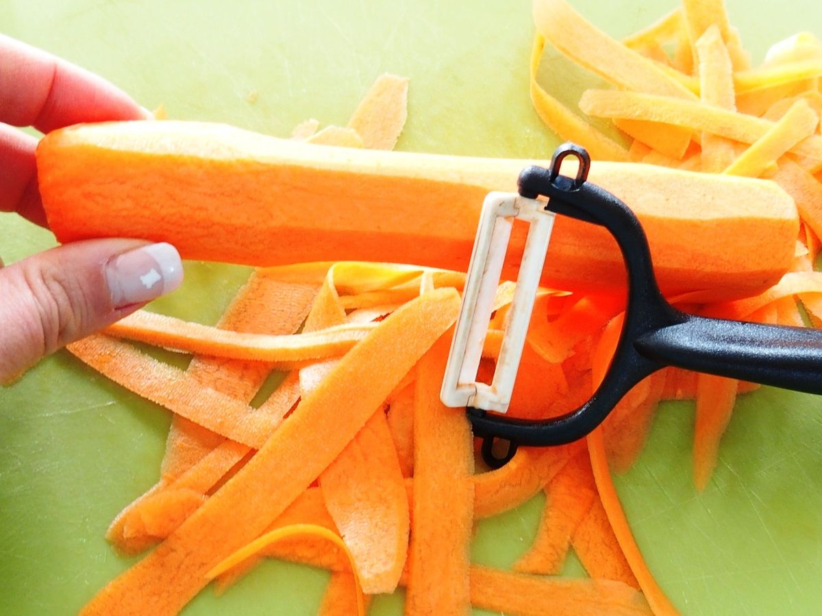 1) Emincer l'échalote. Peler les carottes et les couper en julienne sur la longueur à l'aide d'un économe (épluche-légumes) afin d'obtenir de fines lamelles.